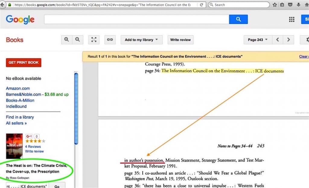 Notice what else is seen in Oreskes’ Bibliography entry for Anthony Socci? Not Ross Gelbspan’s name, but instead the utterly cryptic line “Re: The Heat is Online – The Industry’s “ICE” Campaign.” Ross Gelbspan’s “The Coal Industry’s “ICE” Campaign” website page, in other words.