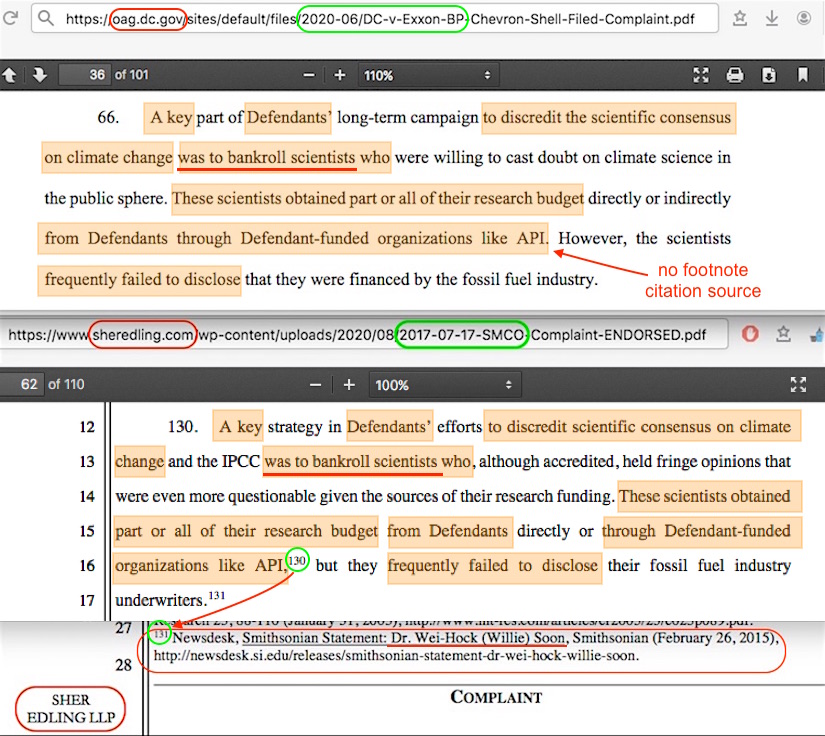 That is an important detail, because it is that very press release which is what the Sher Edling law firm cites as their source of proof that Dr Soon was “bankrolled by fossil fuel interests.” That elemental accusation, in order of appearance in all of the “ExxonKnew” lawsuits, is as follows (those not under Sher Edling ‘handling’ are shown with double asterisks and additional notes where applicable). Click especially on each screencapture image — notice the pattern that immediately forms and continues throughout: