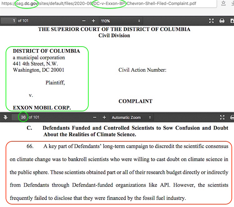 - District of Columbia v ExxonMobil Corp., PDF file page 36 (print page 32) paragraph 66 / no footnote citation (screencapture here); June 25, 2020; identified later as a Sher Edling assistance filing. It is outside of their standard pattern in how it does not specifically name Dr Soon. However, D.C.‘s accusation paragraph is nearly identical to those in the Sher Edling boilerplate copy filings – compare it with Sher Edling’s San Mateo v Chevron, where the citation source ties the accusation to Dr Soon.