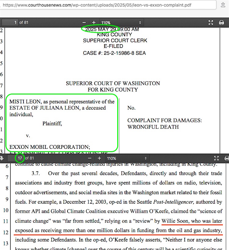- Estate of Juliana Leon v Exxon Mobil Corporation, PDF file page 17 (print page 14) paragraph 3.7 / no footnote citation (screencapture here); May 29, 2025.