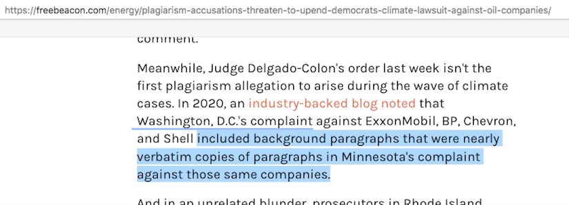 2) “Washington, D.C.’s complaint [ 6/25/20 ] against ExxonMobil … included background paragraphs that were nearly verbatim copies of paragraphs in Minnesota’s [ 6/24/20 ] complaint” — that line comes from the above Free Beacon report, which cited a June 25, 2020 Energy in Depth piece by William Allison featuring side-by-side comparisons from each filing. The EiD comparisons aren’t especially remarkable beyond the identical wording, but what was remarkable was how the two filings with that degree of shared wording were filed by two supposedly separate Attorneys General offices only one day apart.