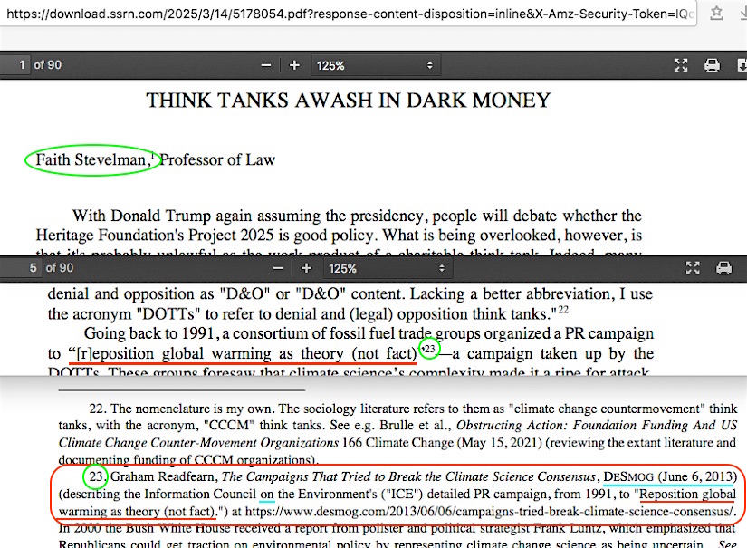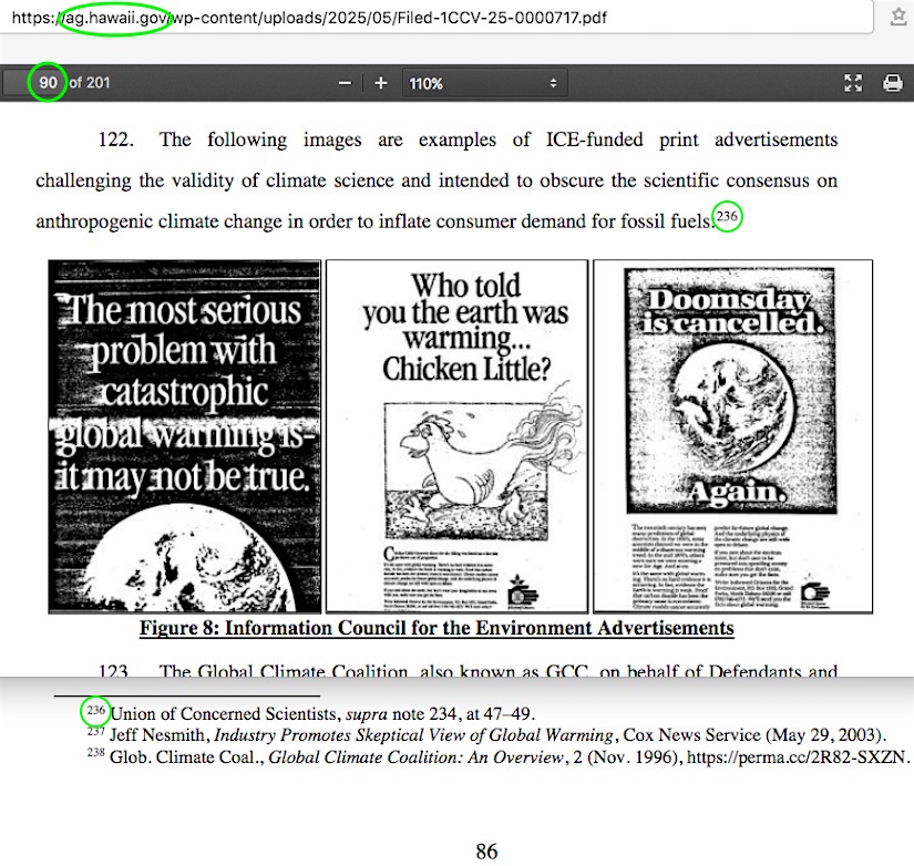 ✓ PDF file page 89, paragraph 120, the “reposition global warming” memos. Worthless to prove any industry disinformation campaign ever happened because it was a rejected proposal to a public relations campaign and its directives and suggestions were never implemented anywhere, including its unsolicited “Informed Citizens” alternative for the actual “Information Council” PR campaign name, and its unsolicited and quite odd suggestion to narrowly target* “older, less-educated men” and “young, low-income women.” As I detailed in my Dec 2024 blog post, that latter false accusation was disproved in congressional testimony all the way back in 1991. But again, as I’ve said many times before here at GelbspanFiles, the “reposition global warming memos” accusation is the literal best that enviro-activists have in their arsenal to use against the fossil fuel industry. Witness how hardly over three weeks ago, it was regurgitated within a religious-orientated article against current Trump Administration EPA Director Lee Zeldin, and published again mere days after that no farther than five pages into a 90 page ‘scholarly paper,’ as though the memo strategy was some kind of established fact totally above reproach. It isn’t. Not in the least. It’s one of the main faults that could lead to Motions to Dismiss every one of these “ExxonKnew” lawsuits – ‘evidence’ that is insufficient to support a claim. Not provided in good faith, either, a Federal Rules of Civil Procedure Rule 11(b) violation.