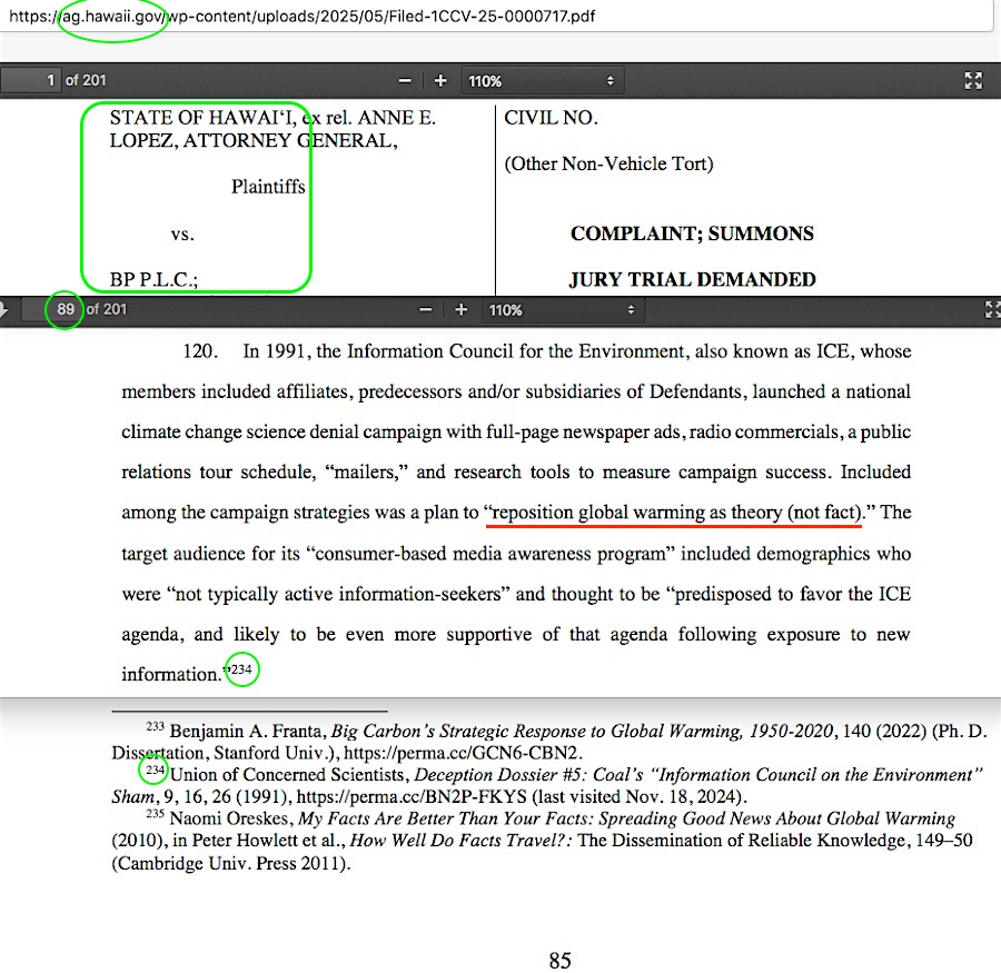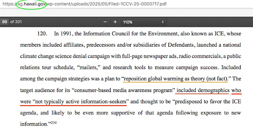 *There a new twist here in this Hawaii filing: Sher Edling’s first trio of lawsuits in 2017 regurgitated that exact “older, less-educated men” / “young, low-income women” accusation, e.g. as seen in San Mateo v Chevron. Their second trio, and every boilerplate copy afterward, dropped the ‘poor females’ part and only stuck with the ‘stupid old men’ part, as in their just-prior Maine filing. What did they switch to here in Hawaii? People “who were ‘not typically active information-seekers’”… Is that an indicator that Sher Edling knows the specific folks mentioned all the way back in Al Gore’s 1992 book are now a bit of a roadblock in 2025 for winning a lawsuit?
