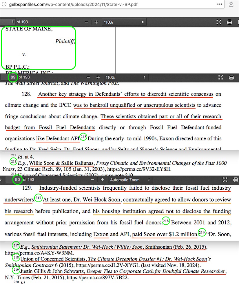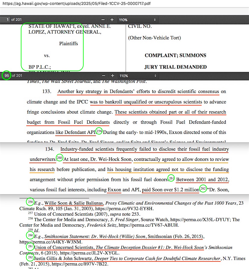 ✓ PDF file page 95, paragraphs 133 and 134, “Bankroll scientists” – a.k.a., the false accusation about former Harvard Smithsonian astrophysicist Dr Willie Soon being bribed by Exxon to the tune of $1.2 million.* Compare the screencapture I have there to this one for Sher Edling’s Maine v BP filing. Identical. They even have the identical “perma.cc” links for the citations in the footnote references. The only thing that changes is the footnote numbers. Even the paragraph wording arrangement is identical. Technically, since the Maine filing at the other end of the country was still Sher Edling’s own work, repeating it here is not plagiarism. But as I detailed in my dissection of Maine, the manner in which Sher Edling strayed from their pure repetition of the accusation directed solely at Dr Soon, the apparent plagiarism they committed in their Maine filing was to drop an accusation directed at the late Dr S Fred Singer into the middle of the standard accusation against Dr Soon. The accusation against Dr Singer was word-for-word identical to the one in attorney Matt Pawa’s 2017 California v BP filing. Not a word of that accusation is true, as I showed in my February 17, 2025 follow-up blog post which focused on the specific Maine filing’s accusation against Dr Singer.
