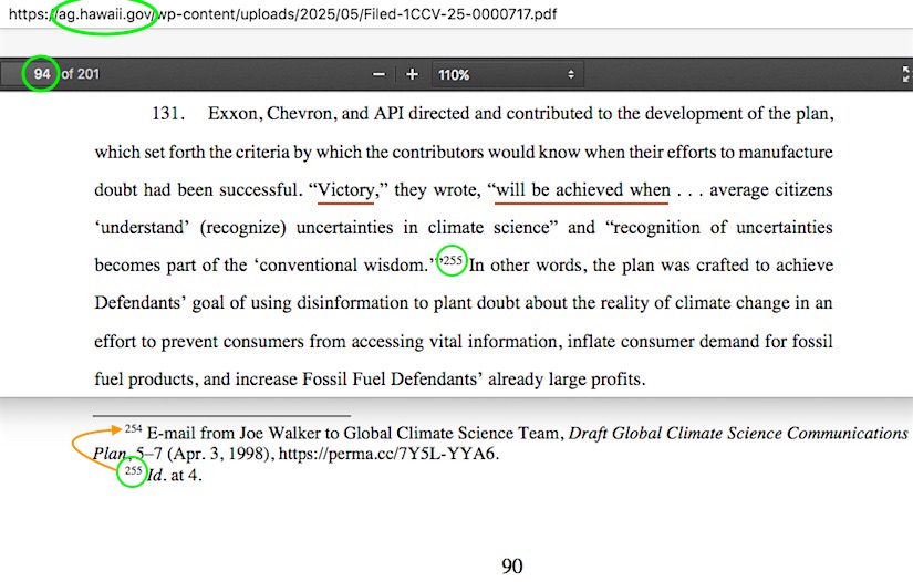 ✓ PDF file page 94, paragraph 131, the “victory will be achieved” memos. It’s the second-best bit of ‘industry memos evidence’ enviro-activists have in their arsenal, it always has been, they read like a bunch of truisms on how the industry – and the public overall – would benefit if more people knew all of the details of the issue, not just half of them. This memo set was also never implemented (never-implemented!) anywhere, but in these boilerplate copy filings (and again like what’s in Sher Edling’s Maine v BP, buried one layer deeper behind the “perma.cc” link variant), all versions of this accusation are plagued by the ultimate source being Kert Davies – there’s that name again – when he worked at Greenpeace.