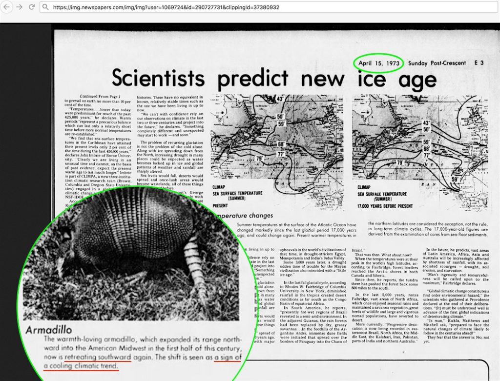 The “Exxon knew as far back as the ’70s” doesn’t. Those were the halcyon days of global cooling. The cutesy animals of the day were armadillos moving south for more warmth. “ExxonKnew’ – meet brick wall. The brick wall of “you cannot bury historic facts.”