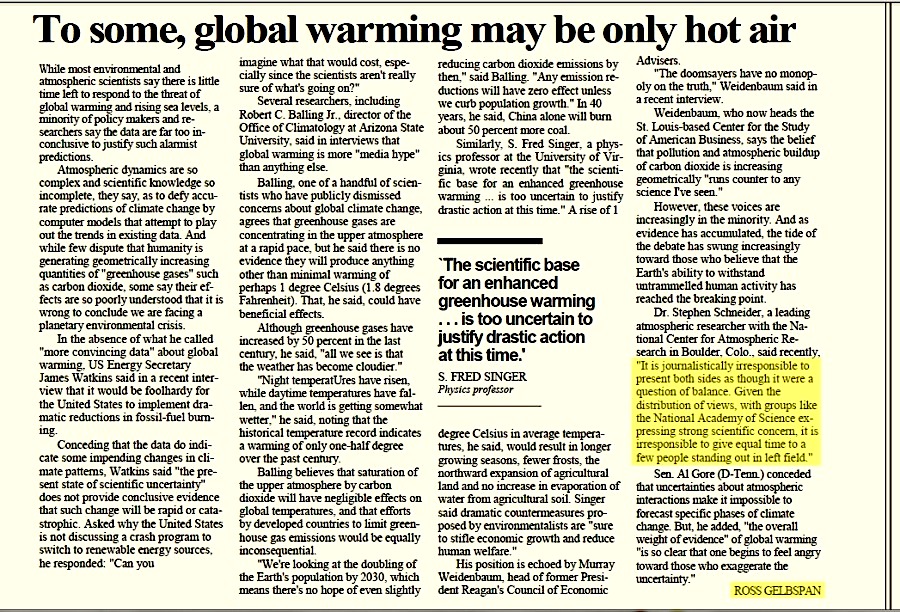 Surprise, surprise, Teya Ryan was elected as a vice president at the Society of Environmental Journalists’ first annual conference in 1991, Stephen Schneider was a speaker at that same conference (full text variation here), and an inset piece Gelbspan wrote within his very last June 1992 article at the Boston Globe quoted Schneider as saying “It is journalistically irresponsible to present both sides as if it were a question of balance…It is irresponsible to give equal time to a few people standing out in left field.”