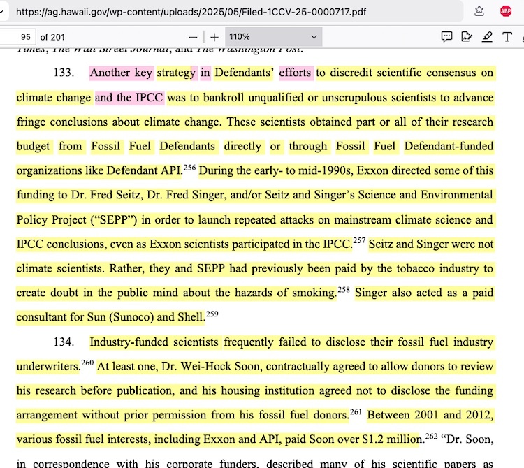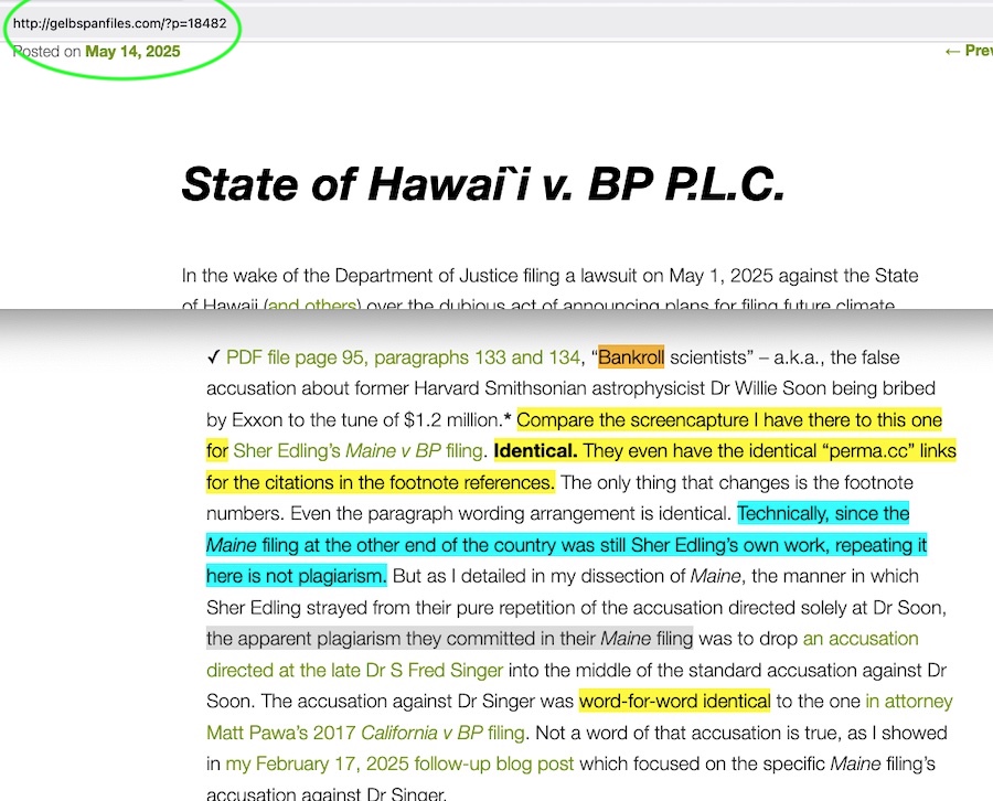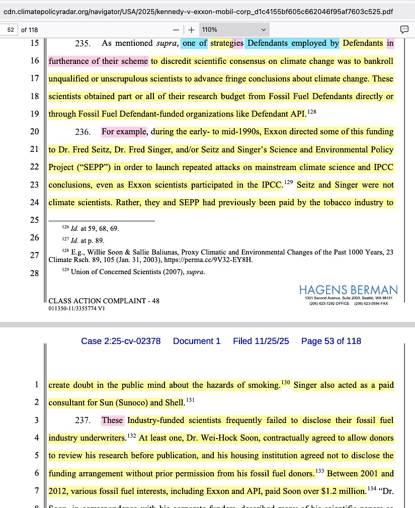 ✓ “Bankroll” scientists” (a.k.a., the Willie Soon accusation among the core Sher Edling accusation elements) — PDF file page 52, paragraph 235. Sher Edling was pretty much consistent in the way they worded their accusation against Dr Soon, never mentioning any other scientist in connection with the “bankroll” word, up until their November 2024 Maine v BP boilerplate copy filing. My dissection of that one showed how Sher Edling strangely split their accusation against Dr Soon in half, and for the first time inserted an accusation against Dr S Fred Singer. Except it was not the first time this specific “Dr Singer” accusation angle was seen in an “ExxonKnew” lawsuit; Sher Edling appeared to plagiarize it straight out of the 2017 Hagens-Berman-Pawa 2017 San Francisco v BP lawsuit. Sher Edling’s May 2025 Hawaii filing continued that new trend. Now, compare Kennedy on this accusation element to Hawaii. Minus Kennedy‘s clumsy initial few words and a few other inconsequential bits . . . . the comparison is not just similar – it is identical.