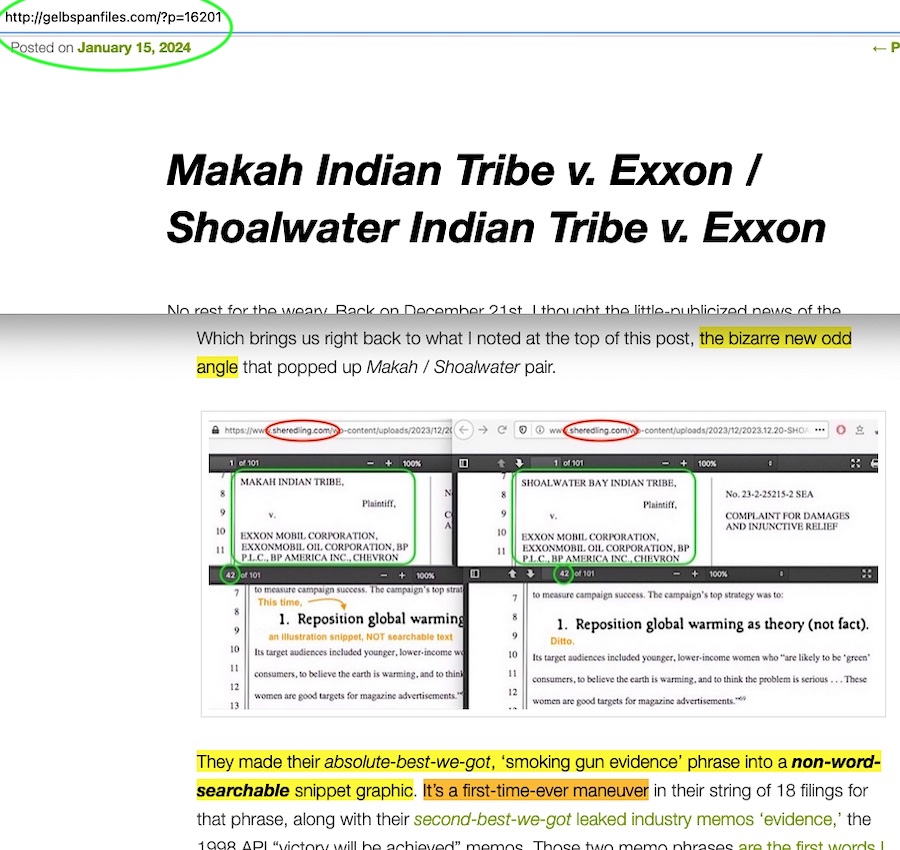 WAIT ….. where have I previously seen ‘text as an illustration’ within an “ExxonKnew” lawsuit? Not in Sher Edling’s Hawaii. Oh, yeah, it was the surprising-to-me-at-the-time appearance of that odd tactic in Sher Edling’s December 2023 Makah Indian Tribe v Exxon filing, and in their twin filing for another Washington state tribe. So, what happens when a comparison is made of Kennedy and one of those tribe filings? Watch this: