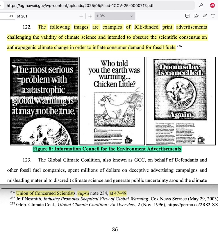 ✓ the “Chicken Little” / “Doomsday” / “Most Serious Problem” ‘advertorials’ trio — in the paragraph immediately following the above “reposition global warming” memo phrase. Compare this trio’s horribly degraded photocopies’ appearances and the text wording about them to Hawaii. Not similar … identical, except Hawaii has an additional label under the photocopies. Slightly different worded footnotes. The people at the Hagens-Berman law firm went with the same cropped “Most Serious” ad presentation that Sher Edling did – not helping matters for each law firm one bit. Neither firm can ever produce an actual newspaper edition where the “Chicken Little” / Doomsday Canceled” advertorials appeared, because neither were published anywhere. But if both firms’ attorneys are hit with the request to produce the “Most Serious” advertorial, each will have to explain why the bottom text was chopped out, and if there is any actual ‘disinformation’ in that text.