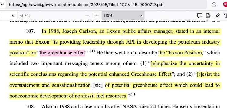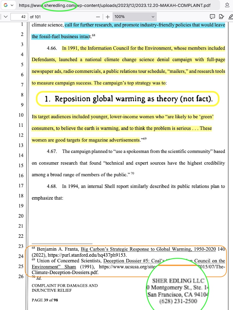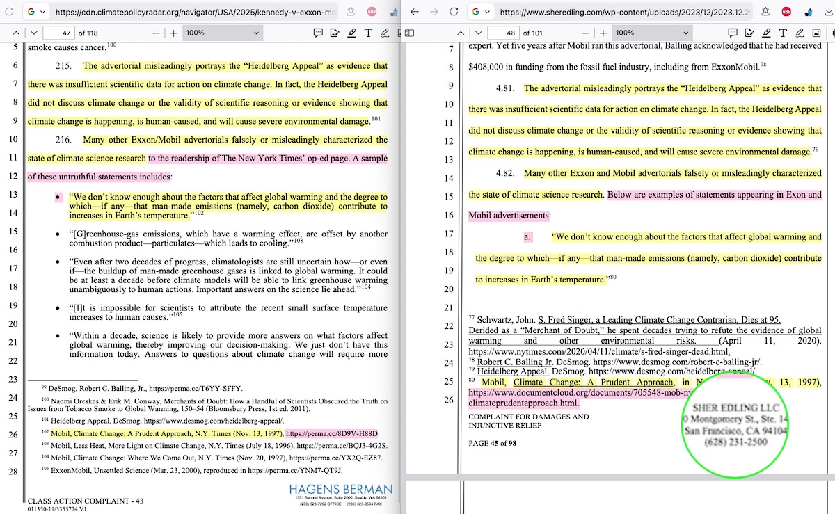 ✓ Ye olde accusation about the (never implemented!) “reposition global warming” memos set — PDF file pages 62-63, print page 58-59, paragraph 270. Compare this filing’s words in that paragraph to Sher Edling’s Hawaii v BP version. Identical. Not similar; identical. Word-for-word. Even the footnotes in both for the accusation are identical, down to the use of the “Perma” site url address, with the solitary difference being Hawaii includes the date the citation was accessed; Kennedy does not.