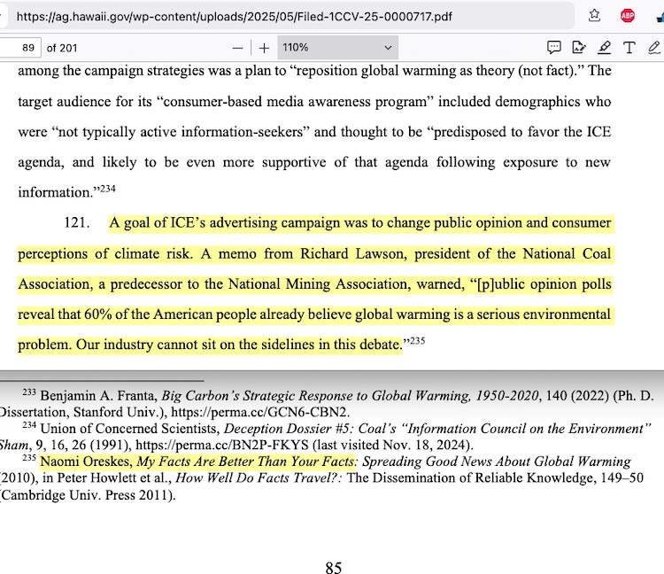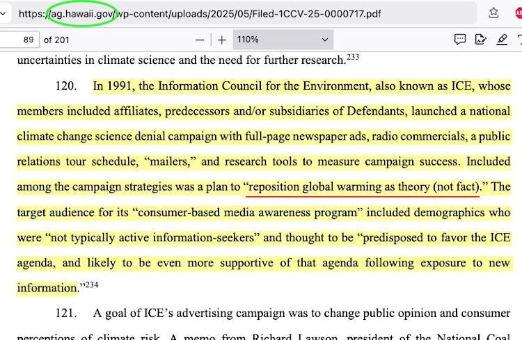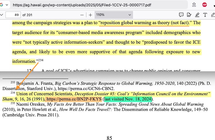 ✓ The “Richard Lawson memo — PDF file pages 63, paragraph 271. Observe: Kennedy – – – Hawaii – identical. Made worse by how the footnote citation for it is Naomi Oreskes, who is on retainer with Sher Edling – presumably as an ‘expert’ on ‘industry disinfo campaigns.’