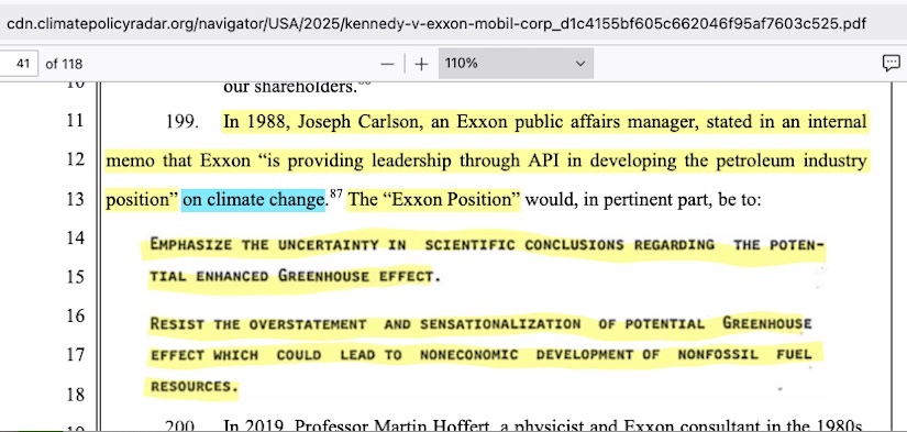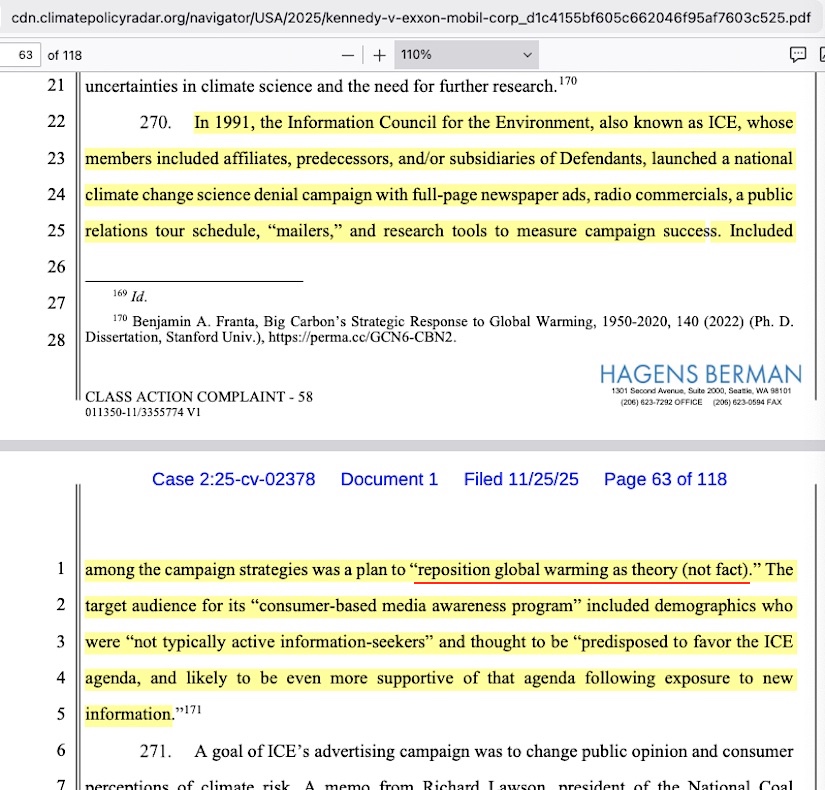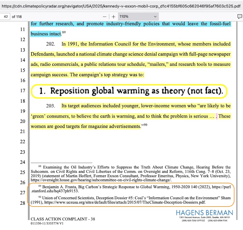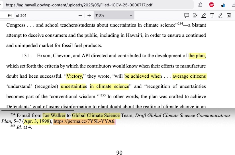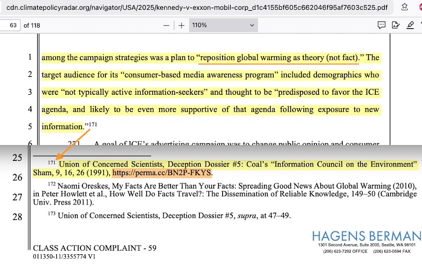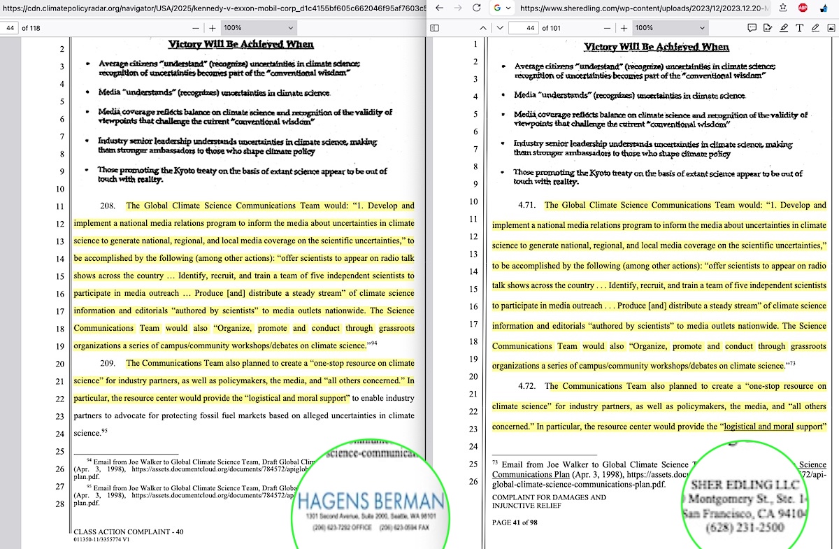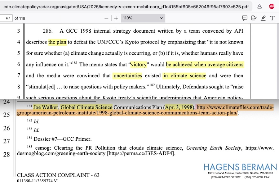 ✓ Ye olde (never implemented!) “victory will be achieved memos — PDF file page 67, paragraph 286. Here, while the basic (and false) accusation is made, Kennedy‘s version (* in this specific instance) is worded quite differently than Hawaii‘s version, including its footnote citation. That right there would be a case study* on how the same narrative can be made, while avoiding any appearance of plagiarism. What also separates Kennedy from Hawaii in this particular instance* is that Sher Edling’s boilerplate copy filings always seemingly sought to bury – via the citation source links going to an innocuous-looking “DocumentCloud” file – how the source for the accusation was Kert Davies (that Kert Davies) when he worked at Greenpeace. The attorneys at Hagens-Berman aren’t shy in the least about citing Kert Davies here – they simply hide his Greenpeace connection and cite his Climate Files version instead. Both his Greenpeace file upload and his Climate Files upload are identical. Not similar; identical. And again, the “victory” memos were never implemented.