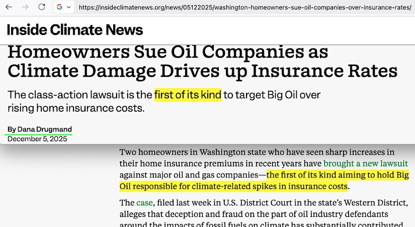 Funny how the [currently innocuously-labeled] Inside Climate News organization (which first glorified Matt Pawa and his Kivalina v Exxon back when they were more accurately political agenda-labeled “Solve Climate News”) has described this Kennedy v Exxon case as “the first to target fossil fuel companies over these skyrocketing insurance costs.” There’s nothing “first” about this lawsuit at all, it has every appearance of being yet another rehash of the same John Passacantando, Kert Davies, et al. [dba Greenpeace USA née Ozone Action / Our Next Economy / CIC ] v. Exxon & any other applicable energy companies that’s been put out since 2017. If the ICN reporter writing that piece was the least bit unbiased (she is not) she would have minimally reported what the seemingly obvious fatal plagiarism problem is with this lawsuit – after a deep examination is undertaken, of course. Give the Hagens-Berman firm points for opening up the plaintiffs field beyond just cities / counties / states.