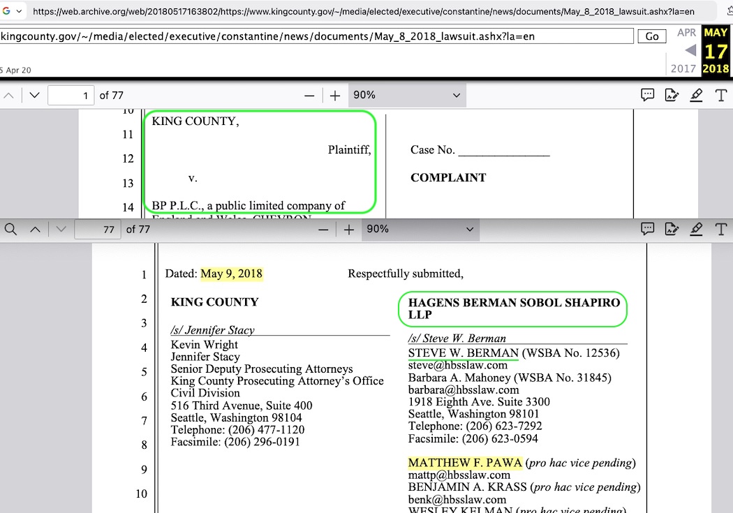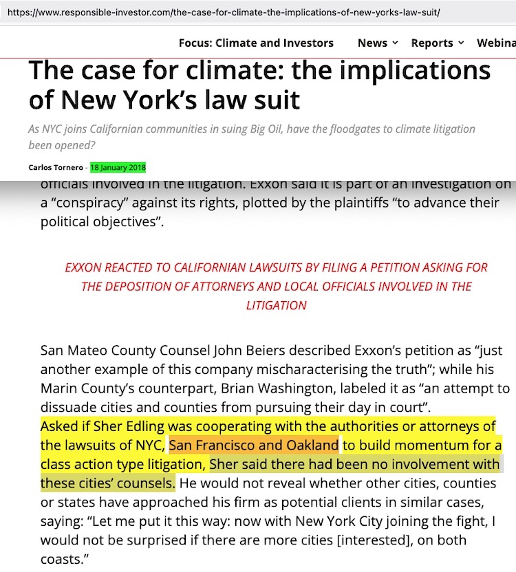 But many questions need to be asked here, beyond my limited ability to ask about them: The Hagens-Berman law firm has not filed an “ExxonKnew” lawsuit since 2018, which was back when Matt Pawa, “the legal brains” behind the climate litigation lawfare efforts, worked for them. Pawa says at his current law firm website that he worked at other firms – without naming who they were. Hagens-Berman’s website pretends like he never existed, and their Kennedy v Exxon filing has zero mention of any involvement with Sher Edling … nor does their entire website. Same in reverse for the Sher Edling site regarding Pawa. or Hagens-Berman. Back in 2018, Vic Sher himself specifically said he wasn’t talking with Hagens-Berman-Pawa about Matt Pawa’s twin San Francisco / Oakland lawsuits. But at Sher Edling’s current website, they say those two lawsuits are under their control. Matt Pawa doesn’t say a thing about those other firms, either. A late 2018 article at The Daily Caller described how Pawa and Sher Edling were not getting along at all, and how the cities of San Francisco / Oakland had fired Hagens-Berman and hired Sher Edling.