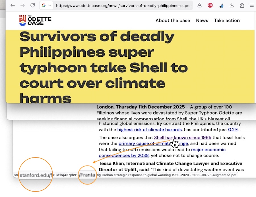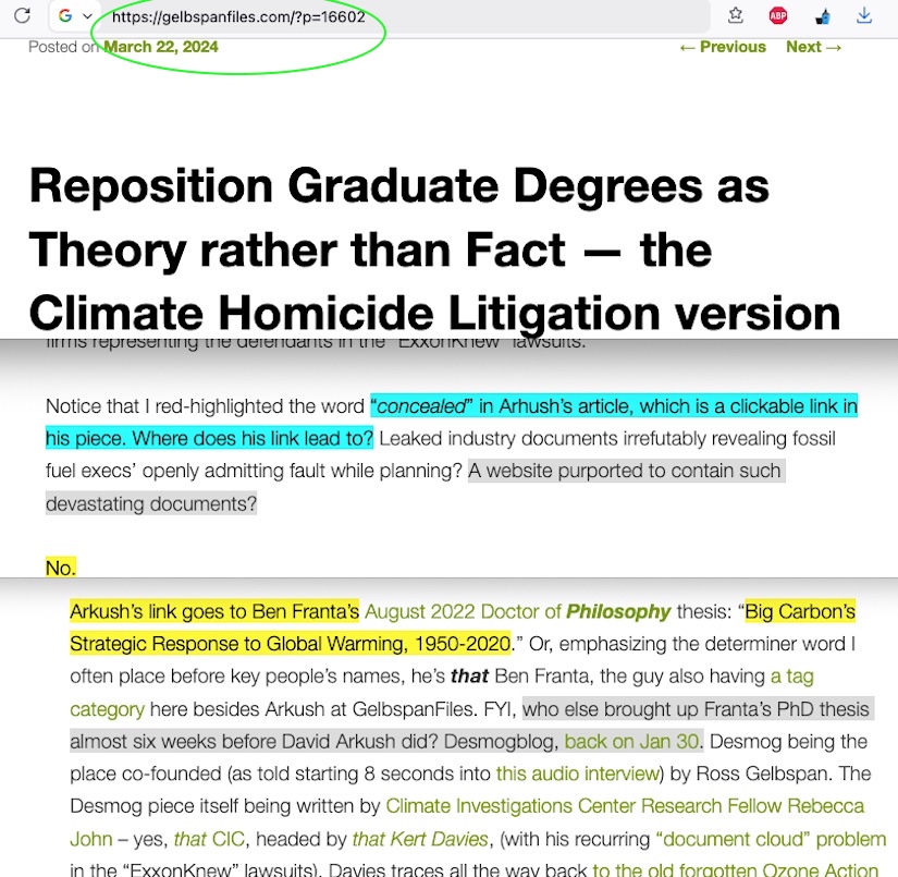 • From the Greenpeace Philippines website specifically set up to promote this UK lawsuit, the clickable link for its words “The case also argues that “Shell has known since 1965” goes to Ben Franta’s PhD thesis written for the degree fulfillment of – not a climate science degree, but instead a Philosophy degree. It’s the very same Franta thesis I took apart in my March 2024 “Reposition Graduate Degrees as Theory rather than Fact — the Climate Homicide Litigation version” blog post. Franta’s PhD paper was a principal citation source for an enviro-activist who’s trying to float the idea that fossil fuel industry executives are guilty of ‘climate homicide.’ That Franta, as I’ve detailed in several of my blog posts, who is only separated by a degree or three from all the other promulgators of the false accusations about industry-corrupted skeptic climate scientists. He seems to be a bit careless over that appearance. Oblivious to his own carelessness. This is the same Ben Franta who I suggested in my April 2022 blog post was one of the weaker links in the chain of accusers who claim fossil fuel industry disinformation campaigns happened.
