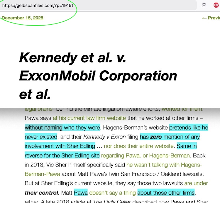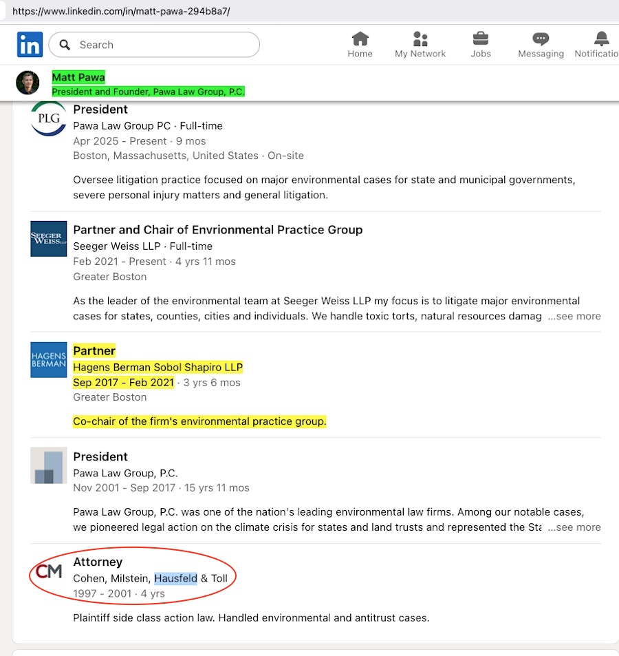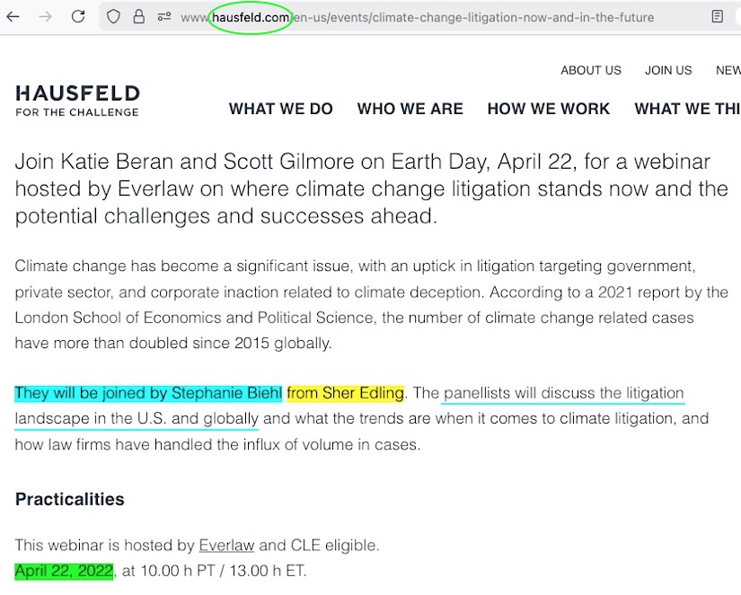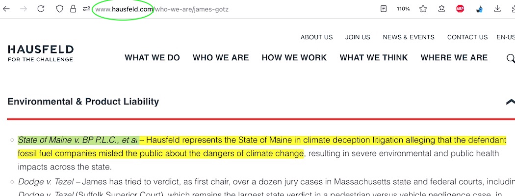 Things get one increment more questionable surrounding Hausfeld’s top-billing foray into climate lawfare via this brand new UK lawsuit. I mentioned them a second time at the end of my dissection of Sher Edling’s Nov 2024 Maine v BP boilerplate copy filing – assisting Maine AG Aaron Frey at the third billing level on the very last page of the lawsuit (after DiCello Levitt, the alleged ‘main handlers’ of Bucks County). At Hausfeld’s own website – the same website as the one about their UK Shell filing – they imply they represent the state of Maine as though no other firm is involved. As showed at the bottom of my dissection of Kennedy v Exxon (which is apparently a quite obvious plagiarized copy of Sher Edling filings) the three attorney figures who figure into that Kennedy filing situation – including Matt ‘the legal brains behind climate lawfare litigation’ Pawa – pretend like they never talk to each other. Seemingly in a breach about keeping behind-the-scenes associations quiet, Hausfeld does dare to mention another firm associated with these lawsuits in a single instance — but with guess who that is? Sher Edling.