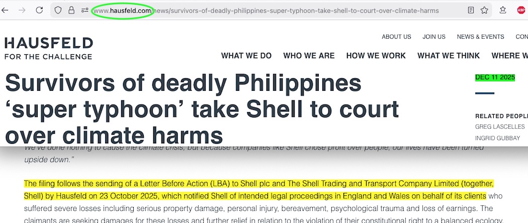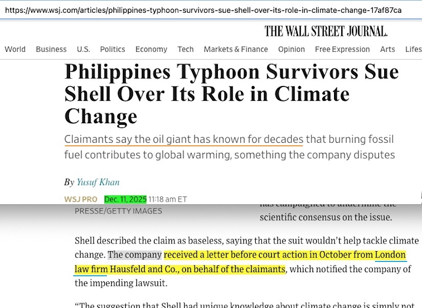 • Wall Street Journal’s report, which has this in paragraph 6: [Shell] received a letter before court action in October from London** law firm Hausfeld and Co., on behalf of the claimants …