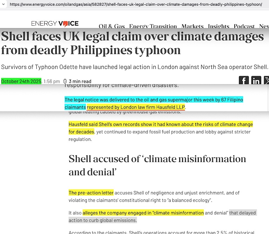 • From the “EnergyVoice” website, we see this, “Hausfeld said Shell’s own records show it had known about the risks of climate change for decades …It also alleges the company engaged in “climate misinformation and denial” that delayed action to curb global emissions.”