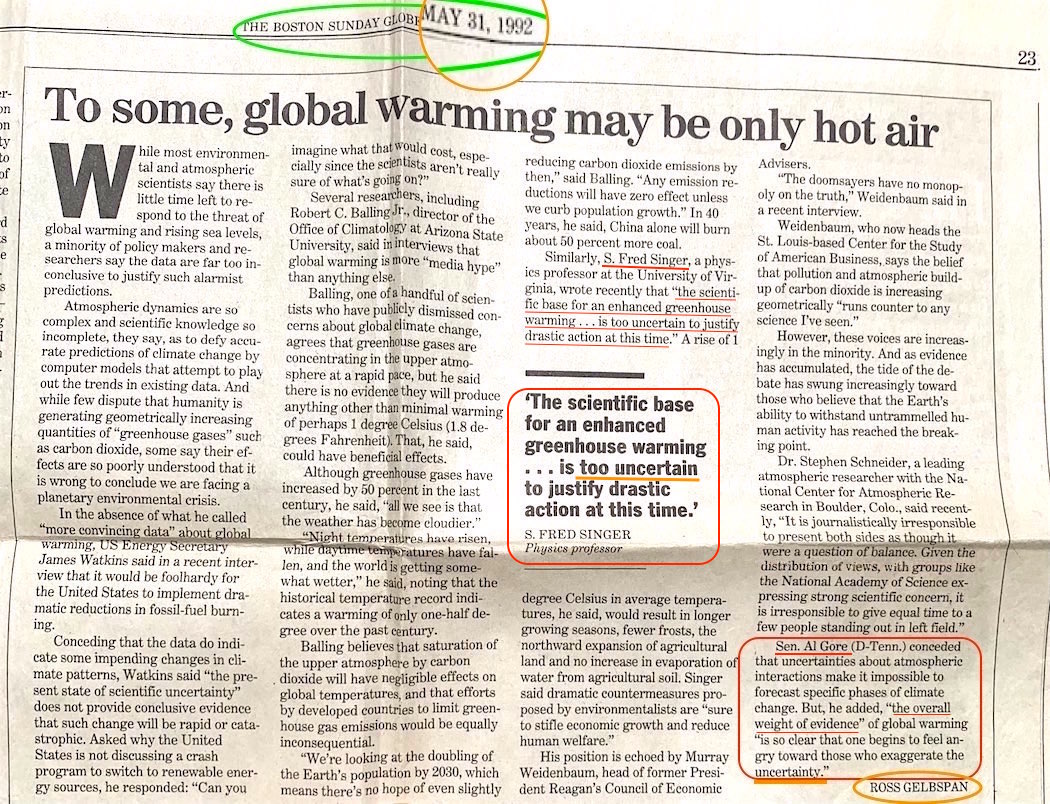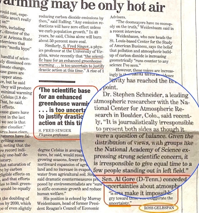 Who politicized the climate issue in its infancy about catastrophic man-caused global warming? Al Gore, a politician, and Ross Gelbspan, news media reporter. – aided in that specific effort, I should add – by NCAR’s Dr Stephen Schneider.