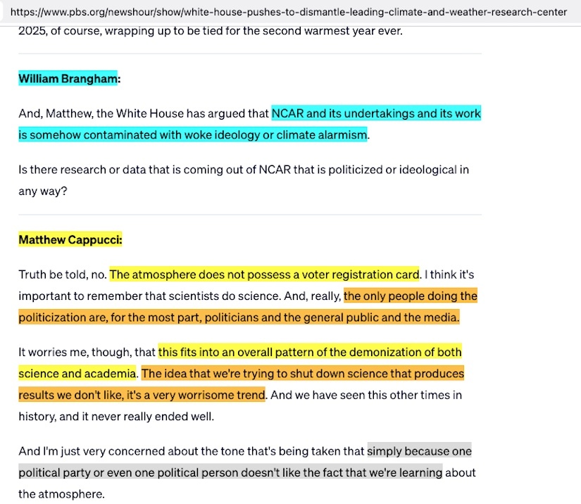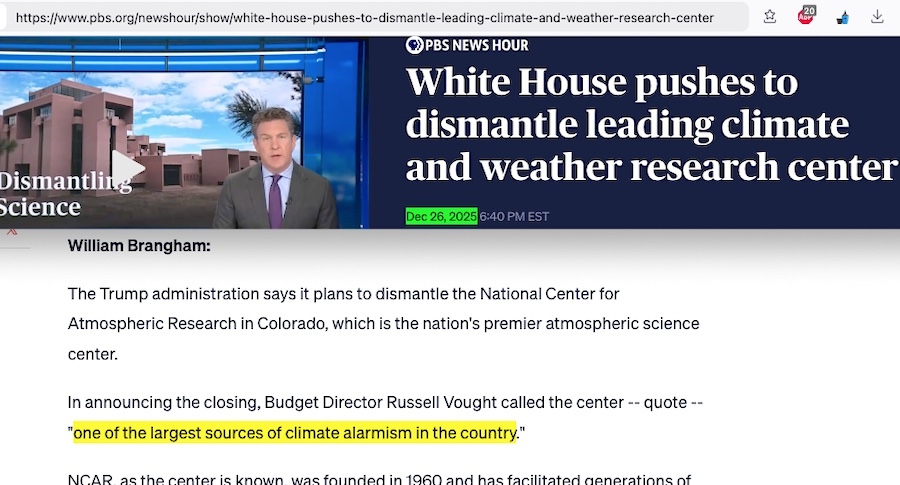 I should be immune – but I’m not – to being stunned by how the global warming true believers are basically guilty of what they accuse their opponents of doing. The spectacular bit happened within the NewsHour’s December 26, 2025 discussion about the planned dismantling by the Trump Administration of the National Center for Atmospheric Research (NCAR). Truth is, NCAR could certainly continue to exist, just not on the government’s dime anymore, but that’s another discussion topic. What was not mentioned in this NewsHour segment was how a former 3-time NewsHour IPCC-associated scientist guest / 23-year NCAR staff scientist was Dr Stephen Schneider – who famously suggested back in the 1970s when he worked at NCAR (53 second point in this video here – that geoengineering to slow or stop runaway global cooling was not a good idea.