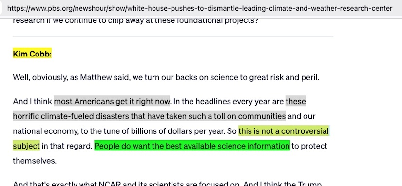‘Cursory’ because neither the NewsHour segment host nor the two guests offered anything remotely resembling what would be interpreted by NewsHour guests as elemental science debate points on how NCAR climate assessments are … well, overly alarmist. The NewsHour segment host prompted both guests to take a stab at that rebuttal angle deep into the discussion. His effort to hand a ‘home run hit’ to the IPCC-associated guest was the angle about President Trump saying the climate issue was a hoax, to which the guest could have readily offered examples of science assertions made by skeptic scientists which were utterly wrong. NewsHour viewers could’ve used that as ammo to wipe out any encounters they have with people who say skeptic climate scientists have legitimate disputes about NCAR or other ‘alarmist’ assessments. Instead, the best she could come up with was ‘looky – carnage everywhere.’ Her alarmist response there begs for meme parody. Give her credit, however, for offering a statement of real truth, that people want the best available information. Ironically, that is exactly what the NewsHour routinely fails to provide.