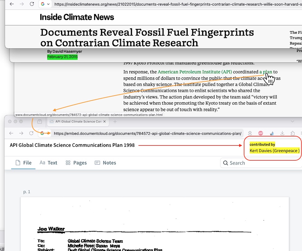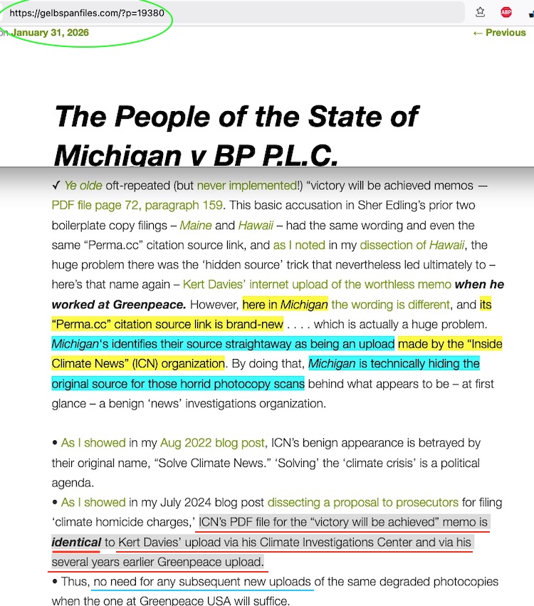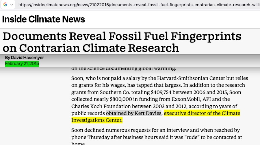#11 That’s also a standalone problem. Who’s “we”? Is that the ‘editorial we’? We – all of us out in the country? Or is Davies again inadvertently pointing investigators toward what might be a big problem if there is substance to be found concerning what looks like his association with Inside Climate News? As I pointed out in my examination of the April 2022 PBS Frontline “Power of Big Oil” program, I thought it looked quite suspect to see Davies self-describing as a ‘curator of documents’ within moments of input from an Inside Climate News person. Even more suspect is how sometime between 2015 and the recent few years – as I showed in my dissection of Michigan v BP – somebody decided to create an ICN-link PDF file for the horrid degraded photocopy scans of the “victory” memo which were identical to Davies’ awful photocopy scans. No need to create any new versions – ICN essentially confirmed that themselves in the months prior to their big “ExxonKnew” news splash; their February 2015 smear effort against skeptic climate scientist Dr Willie Soon featured a link for the “victory” memos straight to Kert Davies 2013 Greenpeace upload of them. But in that article itself, not one of the six mentions of his name identifies him as an ex-Greenpeace operative.