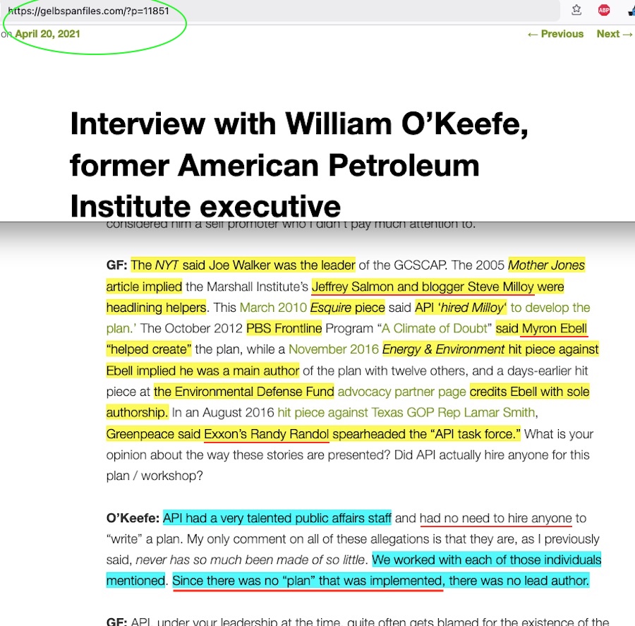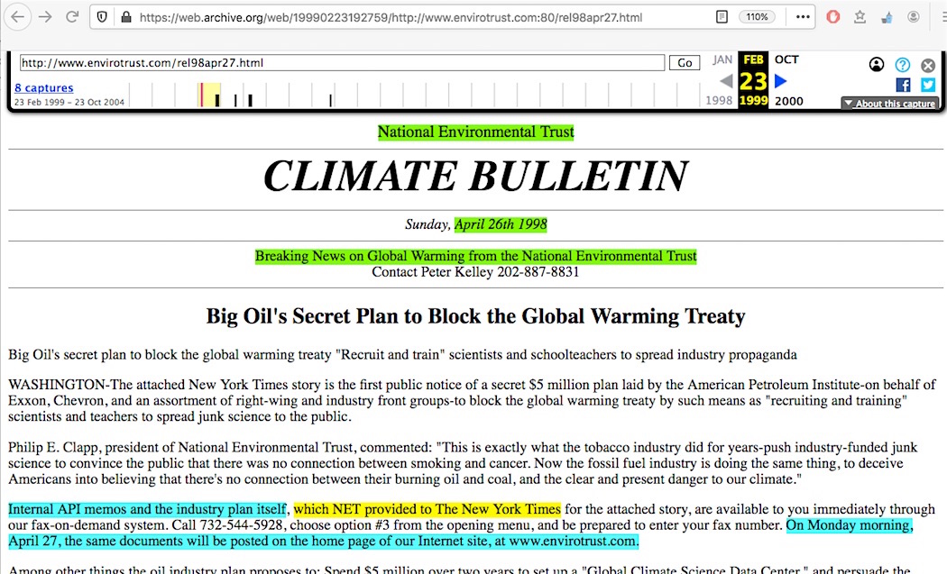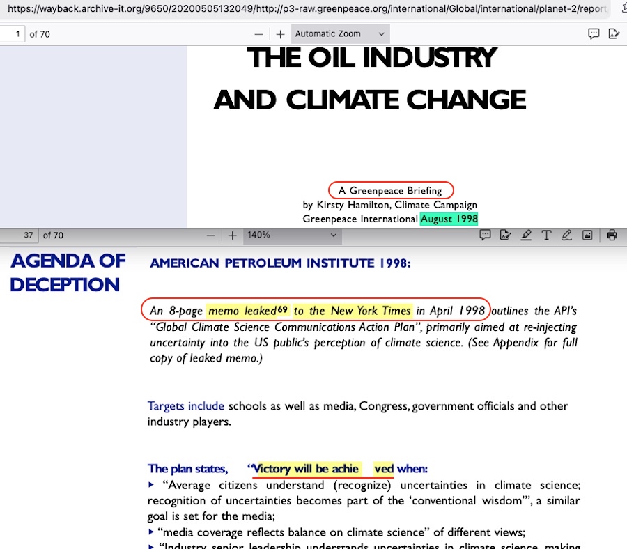 As I detailed in my Jan 2019 post, Desmogblog founder James Hoggan (self-admitted non-expert on climate science) said in his 2009 book that the memo was discovered by Greenpeace, and his blog said in 2013 that Greenpeace uncovered it. Greenpeace’s 2010 “Dealing in Doubt” report claimed the memo was leaked to them. Not to the NET. Greenpeace is not an industry official. Kert Davies worked at Greenpeace from 2000 to 2013. Put Davies under oath on a witness stand or at a congressional hearing, and the odds are much against him on getting any part of this situation straight. Not helping matters one additional bit, Greenpeace’s earliest August 1998 70 page ‘oil industry report’ said the memo was leaked to the NYT.