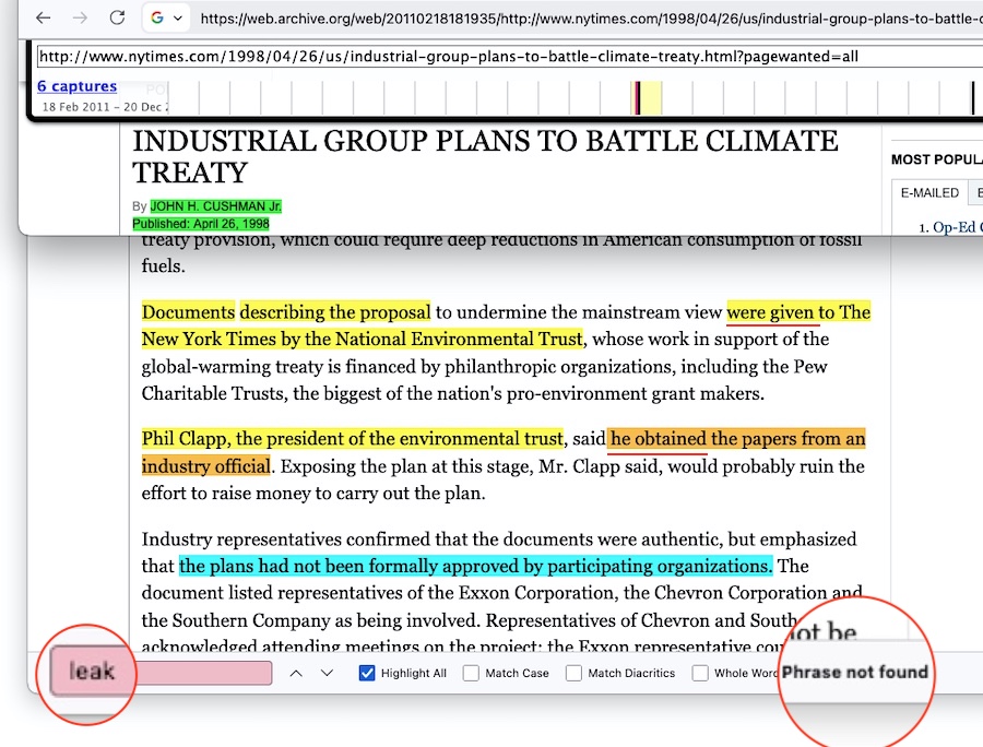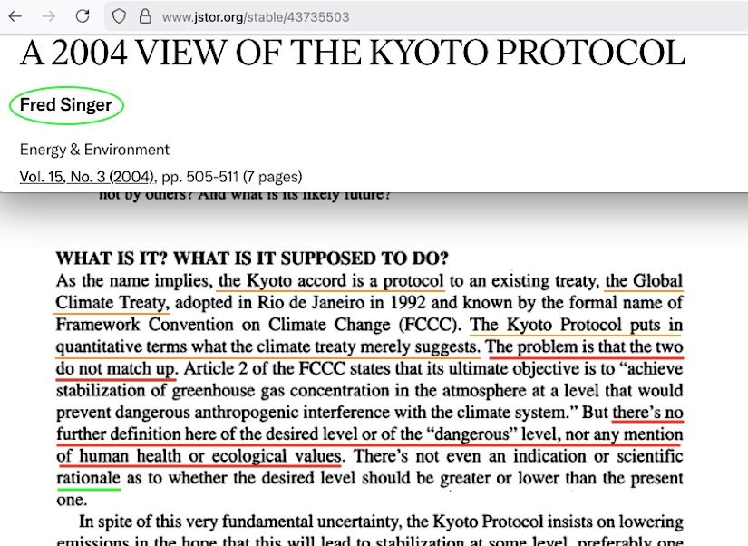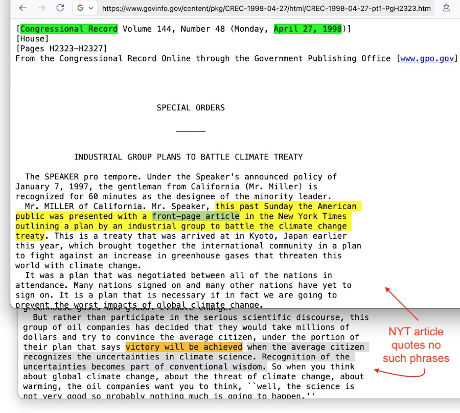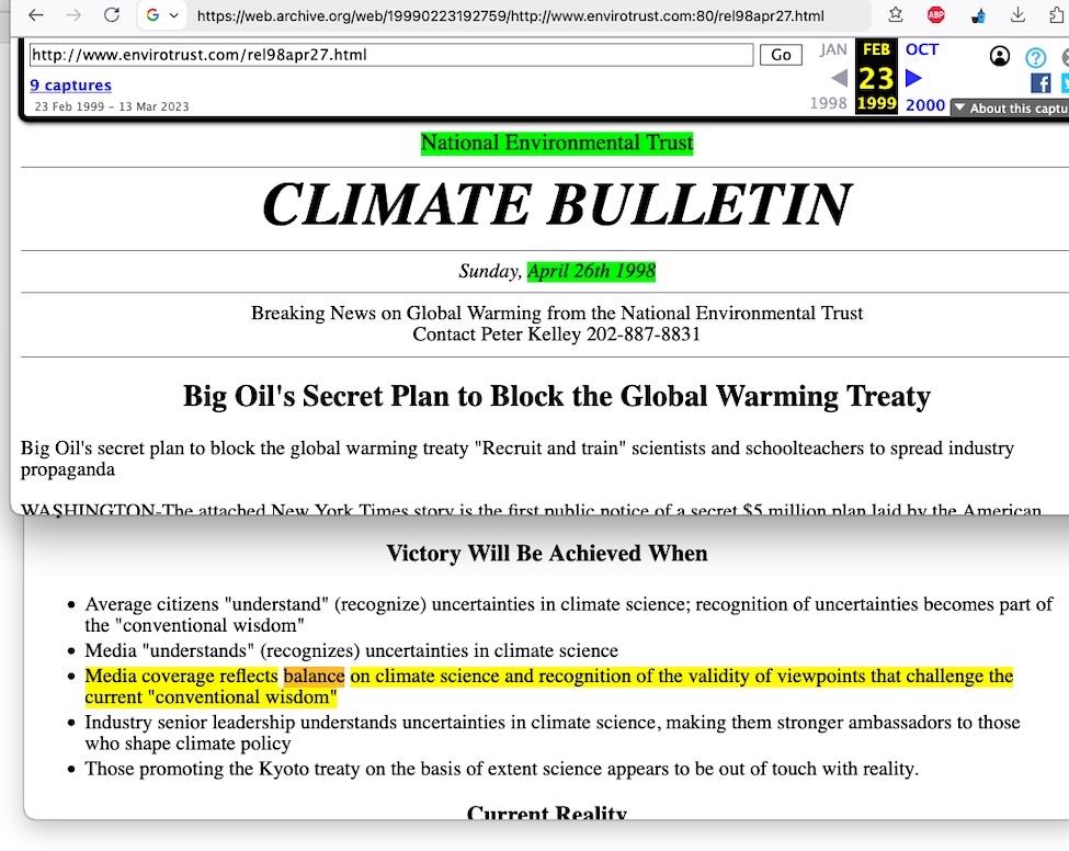 #2 No, Kert Davies can’t even get a quarter of a minute into his video without seriously undermining his own credibility. As I detailed near the bottom of my Feb 2020 post, the National Environmental Trust (NET) group said they outright gave – not leaked – their copy to the NYT. The NYT article itself, “Industrial Group Plans to Battle Climate Treaty” said outright that the memo proposal was “obtained” by the president of the NET from an industry official. The word “leak” or “leaked” never appears once in the NYT article.