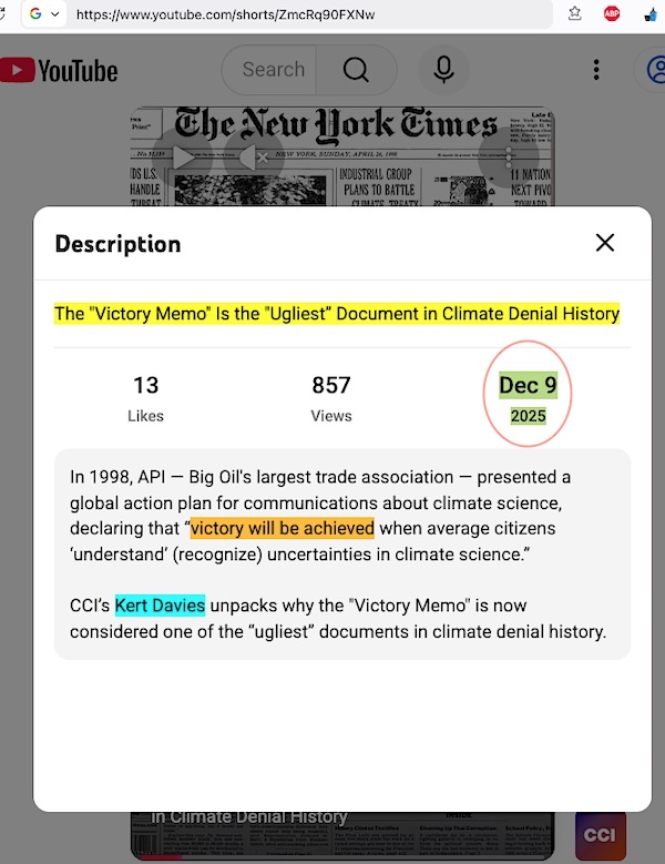 Oh, one more thing … Is it just a pure coincidence that Kert Davies’ little video here was uploaded on December 9th, the same day that the Casquejo v Shell was filed in the UK High Court – the lawsuit in which news reports about it attributed supposedly damaging industry docs to Kert Davies’ Climate Investigations Center?