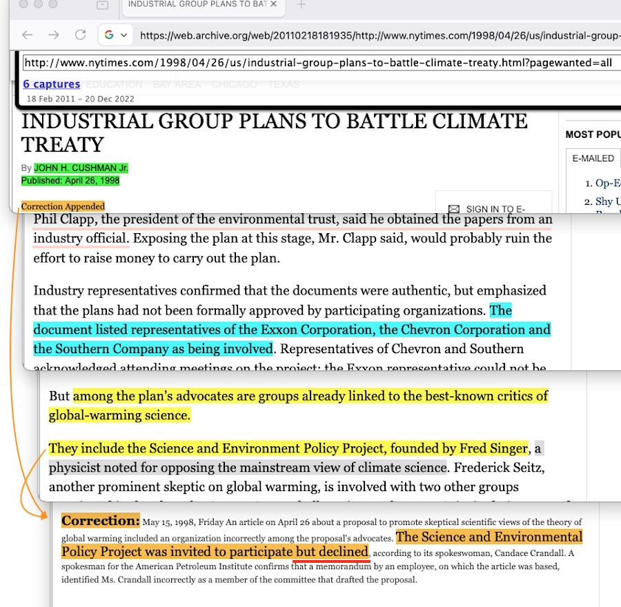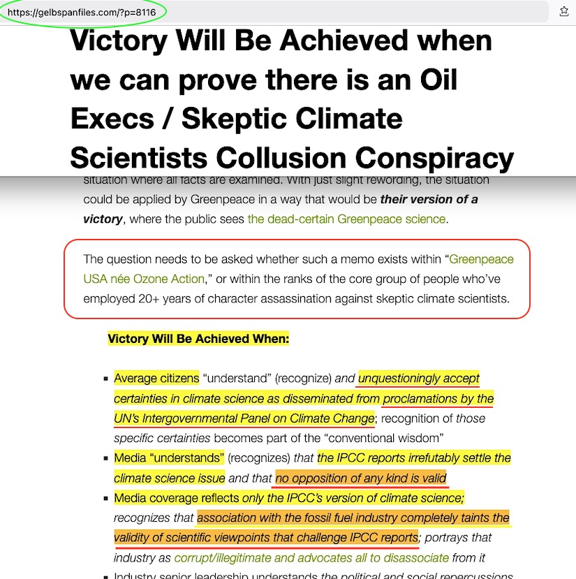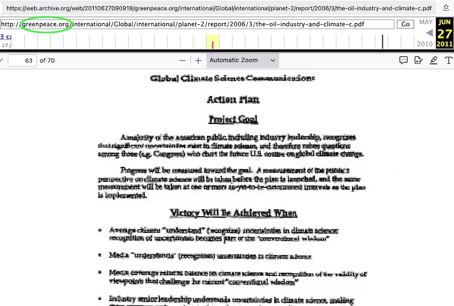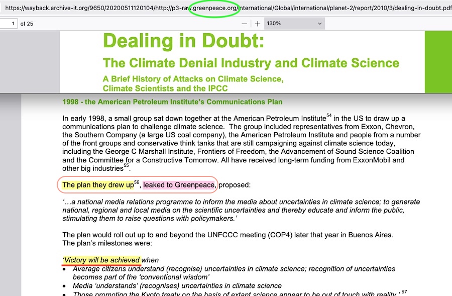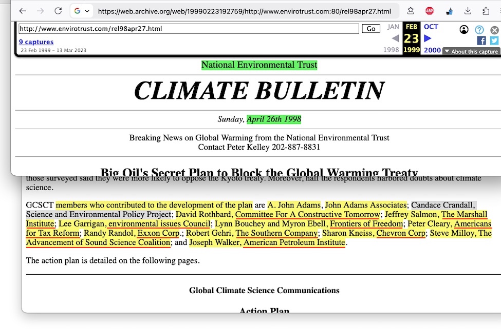 #7 Put Kert Davies under oath on a witness stand or at a congressional hearing, and the odds are much against him that he has an iota of proof the top level executives at Exxon had any knowledge of a plan to deceive the public or even had any real awareness of what this single-day discussion involved. Put him under an oath to testify precisely what the ‘funding’ bought, and he would likely not be able to present a single item of proof that anything bought lies intended to deceive the public. Davies’ old Greenpeace-operated ExxonSecrets site (now offline) was filled with funding figures, and is still largely preserved at the Internet Archive, but the challenge would be for him to point to any specific item of evidence proving the funds bought material where all participants knew it was disinformation.