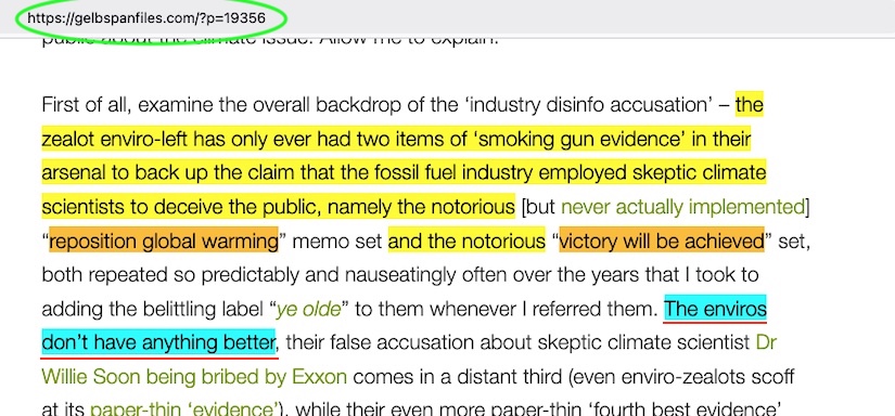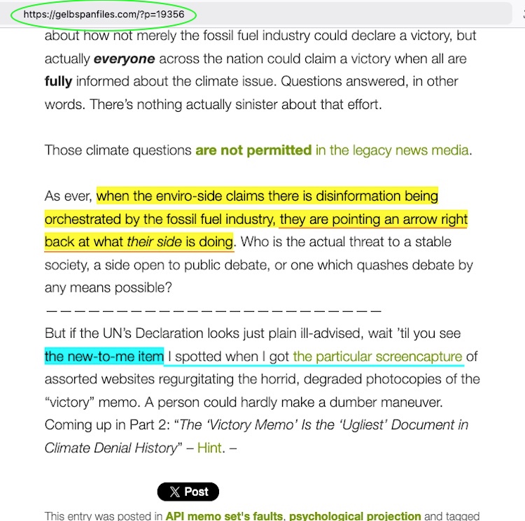 Yet here we are today, approaching 28 years later after the ‘big media splash’ about the memo set, and particular people are promulgating that set like it is the #1 be-all, end-all smoking gun evidence to indict the industry of treacherous deception. As in, what I was hinting about at the end of my Part 1 post. The promulgator has once again offered up his head on a silver platter to the defendant law firms representing the energy companies named in the “ExxonKnew” lawsuits across the U.S. – and potentially to the defendants in the (still M.I.A.) UK-filed Casquejo v Shell lawsuit.