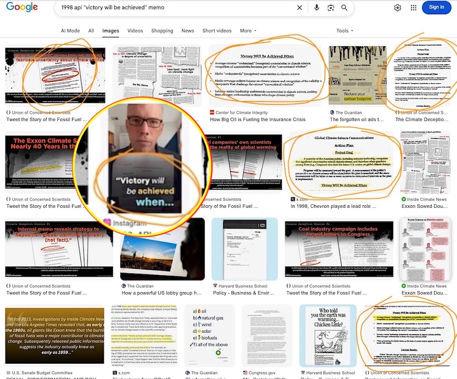The promulgator I’m speaking of is the face that practically jumped right off the internet image search results page I wanted to use to show the sheer repetition of the “victory” memo. The face of Kert Davies. That guy, the one I have in a Background post covering all of his associations with the four central – and utterly false – accusations about the fossil fuel industry employing skeptic scientist ‘shills’ in disinfo campaigns. That particular image / link result was for his 2 minute 14 second video with the title proclaiming “The ‘Victory Memo’ Is the ‘Ugliest’ Document in Climate Denial History.”