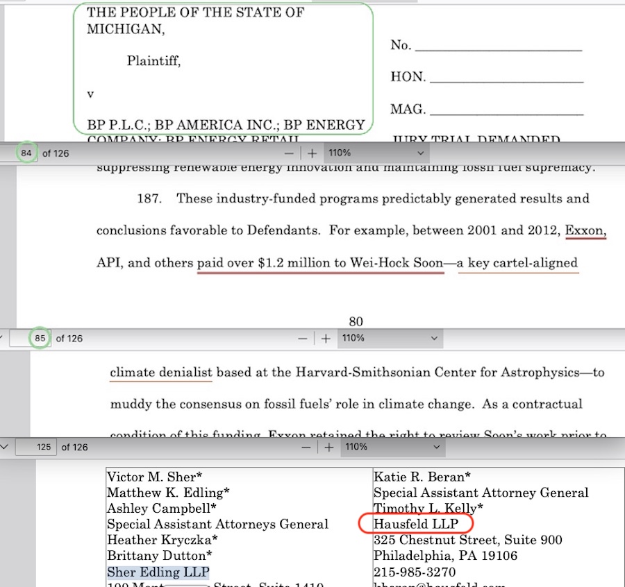 44th: ExxonKnew”-style lawsuit overall, 30 of which are still current: Michigan v. BP P.L.C. (1/23/2026) — Sher Edling #23 boilerplate copy overall, 16 of which are still current. PDF file here, I’ll post my dissection of it at the earliest available opportunity. In the interim time, notice who one of the assisting law firms is in the last two pages of the filing, and how that firm supposedly ‘assisted’ in the Sher Edling pure boilerplate Maine v BP filing, and how that same ‘assisting’ firm is the sole firm claiming to have filed the [so far, MIA] Casquejo v Shell lawsuit in the UK High Court.