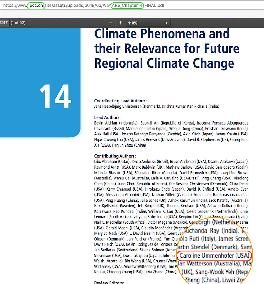 • Caroline Ummenhofer – 1:April 5, 2025. Dr Ummenhofer’s PhD is in mathematics, and she is not identified as an IPCC-associated scientist in this segment, but she was clearly identifies as a Contributing Author in an AR5 IPCC chapter.