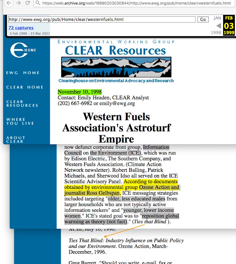• CLEAR site — By using the Internet Archive to look for what Burton & Rampton’s PR Watch article was citing, it can be seen that they were citing CLEAR’s old catch-all site home page. Good luck finding anything among all the possible link paths remotely about “attack the proponents.” An educated guess, however, of what Burton & Rampton were referring to is likely a report CLEAR was in the process of compiling about the Western Fuels Association which didn’t get published until Nov 1998. In that one, CLEAR noted about ye olde “reposition global warming” memos that the set had been “obtained by environmental group Ozone Action and journalist Ross Gelbspan,” the source for that assertion being a “Ties that Blind” report by Ozone Action. Hold the thought for a few moments, about where the word “attack” appears within those memos, the hint of which Burton & Rampton already offered in their PR Watch article.