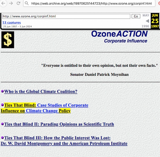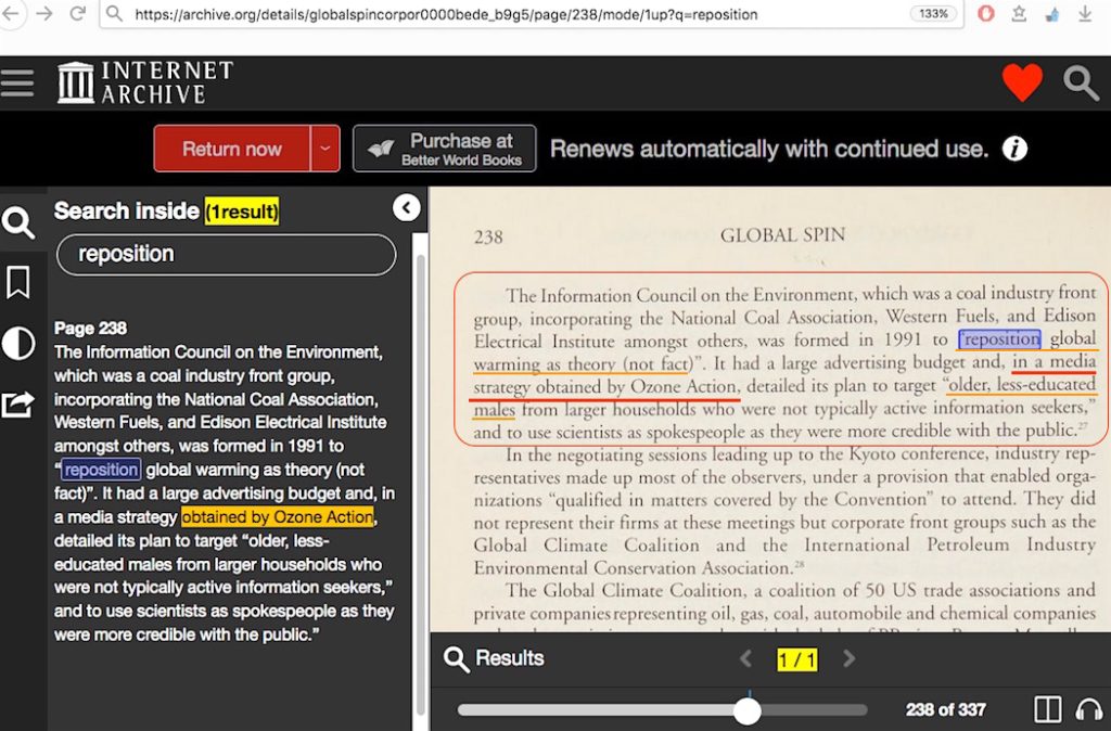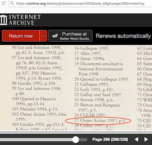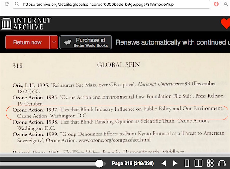 • Sharon Beder’s “Global Spin: The Corporate Assault on Environmentalism”book. You can search through an entire book scan (after setting up a free account login). The word “attack” is found 19 times, but never refers to an attack on science, mainstream or otherwise. Do a search for the word “reposition” and just one result comes up. She says her source is “a media strategy obtained by Ozone Action,” her footnote #27 goes to “Ozone Action 1997, page 5” which is that group’s “Ties That Blind” report. Notice how she did not say that Gelbspan also obtained the memos. Since her book was published in January 1998, she would have been referring to Ozone Action’s particular industry influence report from likely not later than mid 1997. The online report only occupies two pages, but the latter part of it matches up well with what’s in her book – minus the bit about Gelbspan obtaining the memos. Ozone Action’s report does not contain the word “attack” at all.