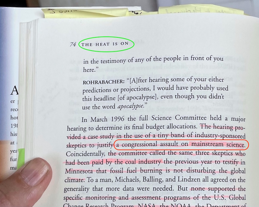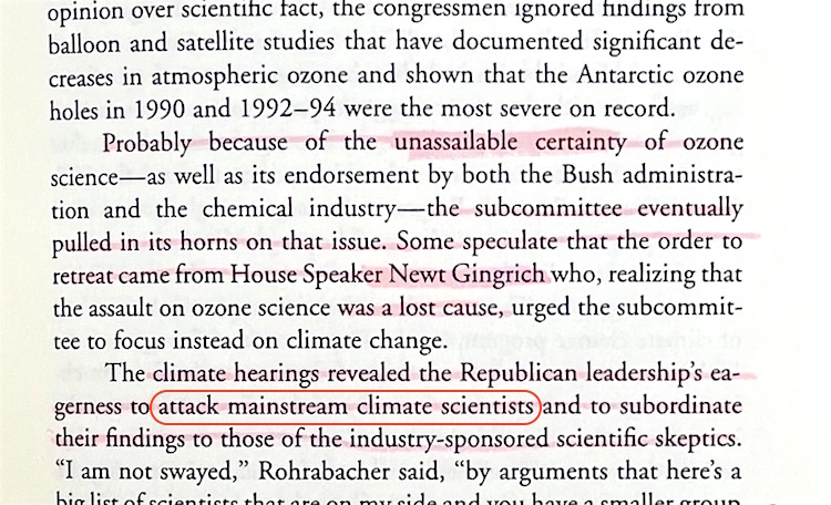 • Ross Gelbspan’s 1997 book … which almost contains the specific “attack mainstream science” accusation twice in his “A Congressional Book Burning” chapter — the first instance aiming it at congressional Republicans, and the second instance aimed at skeptic climate scientists — but hold that thought for another moment on where he said it elsewhere like what’s basically seen in the current San Francisco / Alameda County and Maine lawsuits, which is a massive problem.