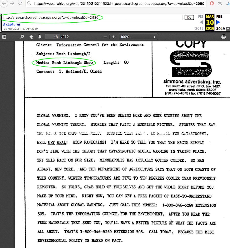 Read the actual print ad text in the ICE newspaper advertorials — do those look like outright attacks of climate science, or do they simply question what was being said at the time? Read the actual text for the single taped radio ad by Rush Limbaugh — does that constitute an attack on science in any sense of the word?