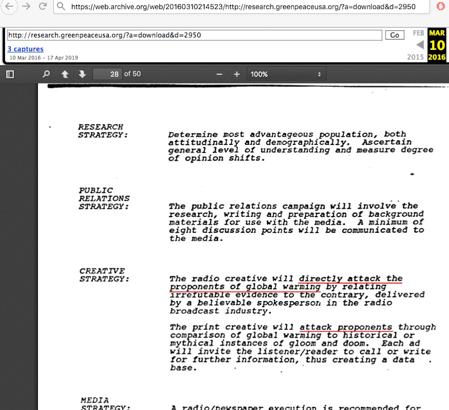 Burton & Rampton’s reference to “attack the proponents of global warming” – and thus the Maine v BP‘s / California v BP accusations – is seen on scan page 28 in what appears to be genuine memo pages that were a part of the official “Information Council for the Environment” public relations campaign (as distinguished from the rejected memo set with the “reposition strategy and unsolicited spelled-out name variant and rejected narrow audience targeting suggestion).
