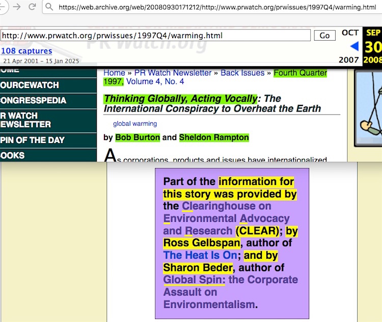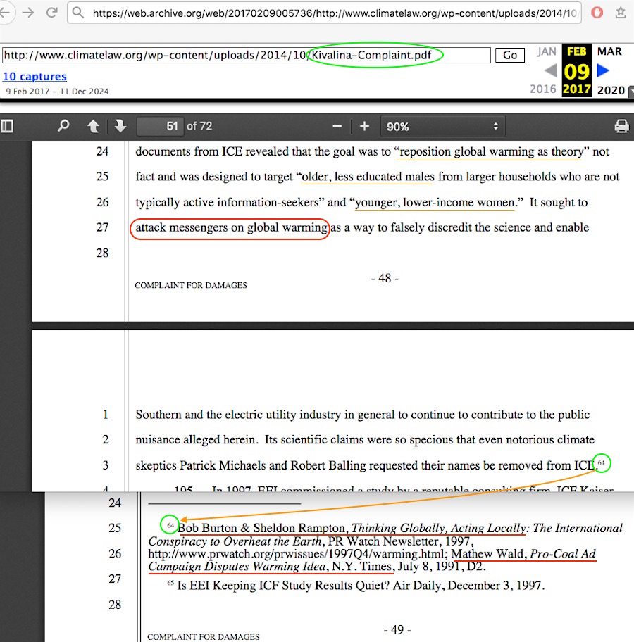 What’s the source in Kivalina for that accusation? Two sources, which I covered in my dissection of that filing, but the latter of the two is Matt Wald’s 1991 NY Times article which never uses the word “attack” at all. The first source, Bob Burton and Sheldon Rampton’s “Thinking Globally, Acting Locally” PR Watch article does indeed use the ‘attack the proponents’ line, but in a manner which only undermines the entire accusation because of the citation cascade tactic they use with their own three sources in order to make it look like they have more than one source. The filers of the current “ExxonKnew” lawsuits do essentially the same tactic, hoping nobody has the time or temperament to look deep into this material.