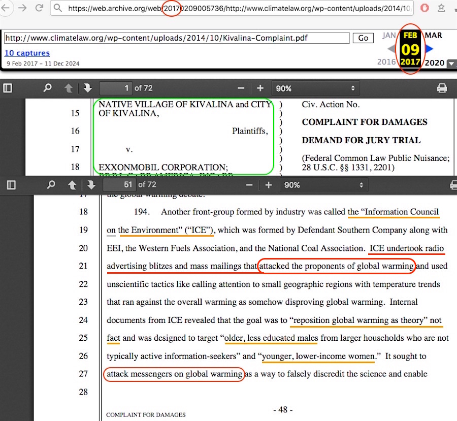 The key to getting to the bottom of the origins of the ‘attack mainstream science’ accusation is the “Pawa” name and what he is a little more famous for, as in being the “brains” behind the climate lawfare effort – meaning his launch of the first-ever such lawsuit, his 2008 (dismissed in 2012) Village of Kivalina v Exxon. Look within that one, and the very first instance is the same ‘attack the proponents’ line in his 2017 pair of lawsuits and Sher Edling’s Maine; the second instance in the same paragraph connects the ‘attack’ word to the accusation about ye olde “reposition global warming” memos, a hint of where the whole accusation begins to fall apart.