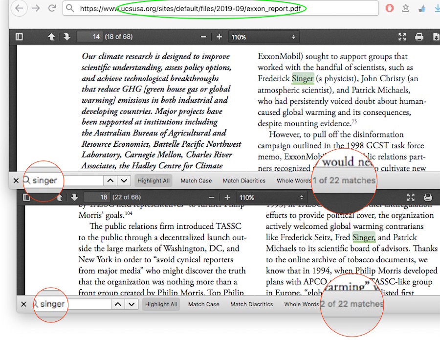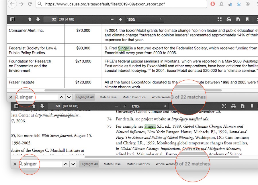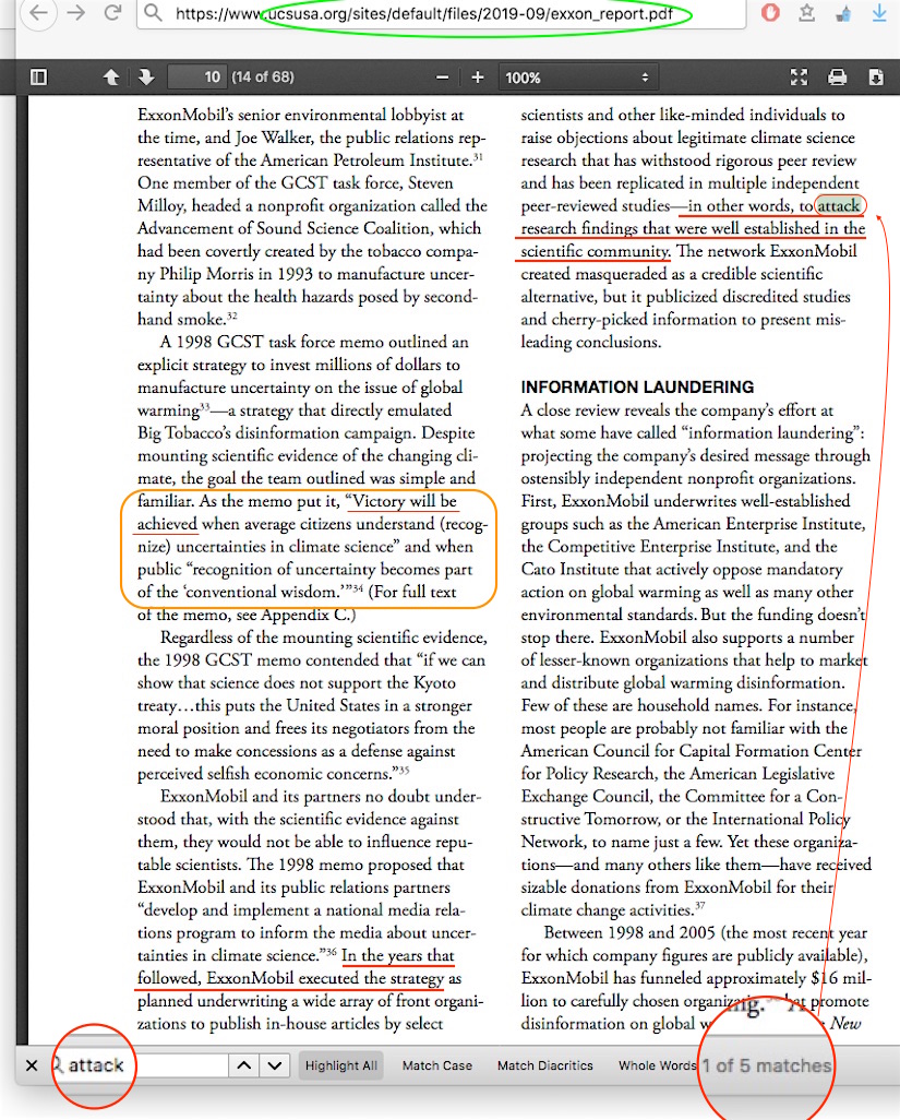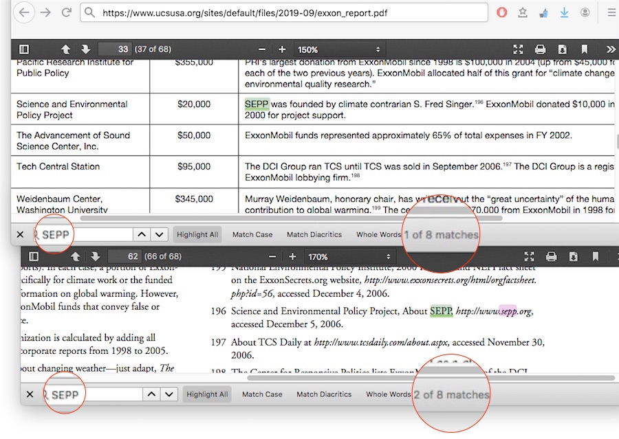 No need to trust me on whether the ‘attack mainstream climate science’ bit is in the UCS Smoke & Mirrors report, the whole thing in its full 68 page context is here. Of the five results for the word “attack,” the best this report can come up with is an unsupportable connection to ye olde 1998 American Petroleum Institute’s “victory will be achieved” memo. Unsupportable — because the memo was never implemented. Never implemented! Dr Singer is only mentioned twice in the report’s main passages, but not with any connection to any ‘attack, and the 22 other instances appear either in attached table lists, or in end note references, SEPP even less.