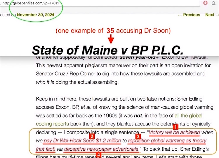 But where their troubles become massively more compounded concerns their four central outright accusations — I’ve summarized those lawsuits’ core accusations into a single sentence for simplicity’s sake — “Victory will be achieved when we pay Dr Wei-Hock Soon $1.2 million to reposition global warming as theory (not fact) via deceptive newspaper advertorials.” These hapless AG’s provided all four here in their gigantic Appendix presented to SCOTUS, plus the additional accusation against Dr Will Happer.