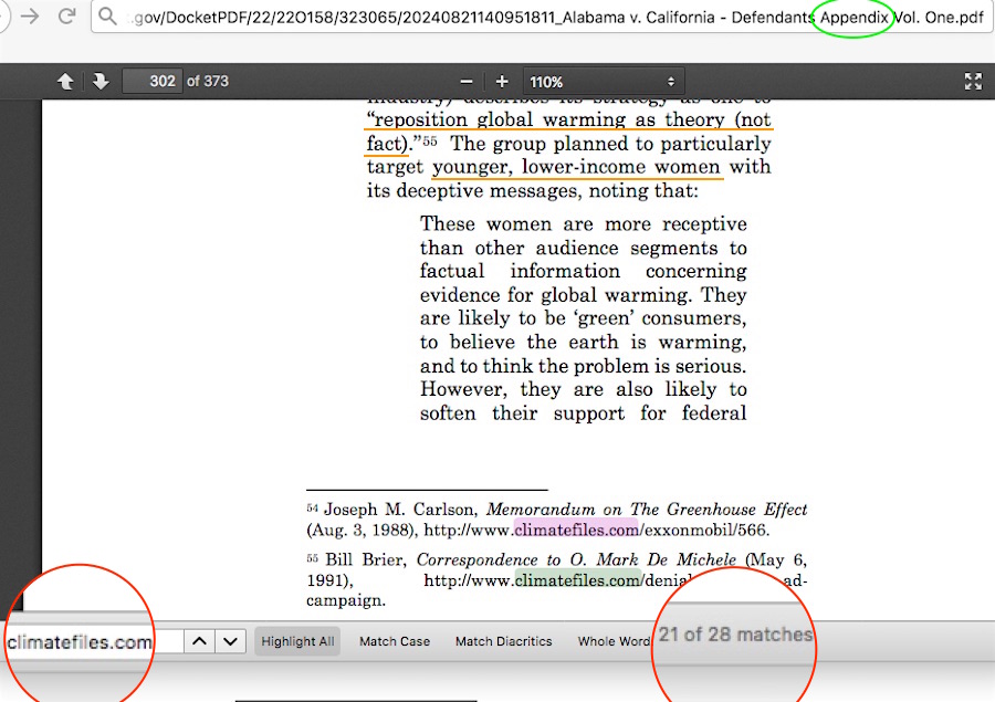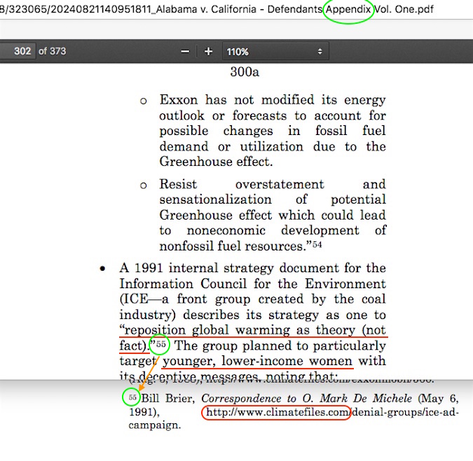 ✓ PDF page 302 (print page 300a, which is the section the above-noted “App 300a-302a” refers to) — the memo directive to “reposition global warming” in a public relations campaign created to target “younger, lower-income women.” That memo directive was an unsolicited proposal along with its targeting suggestion to the campaign, and those proposal ideas were never implemented (never implemented!) in any manner.