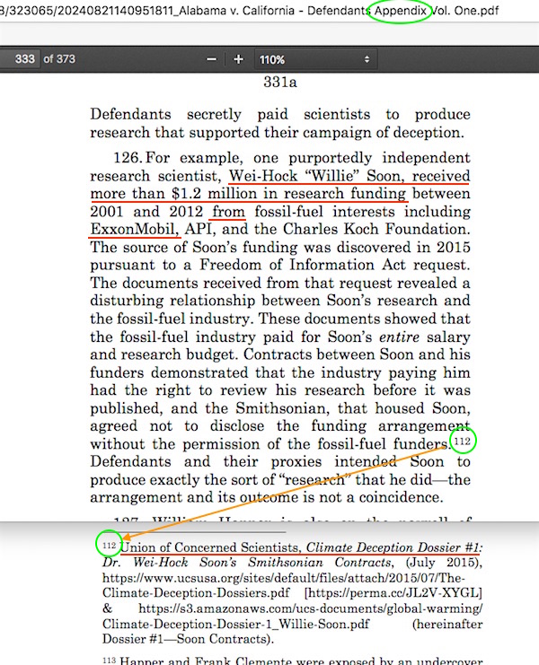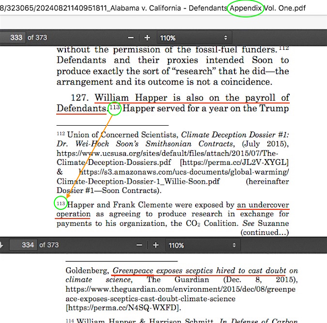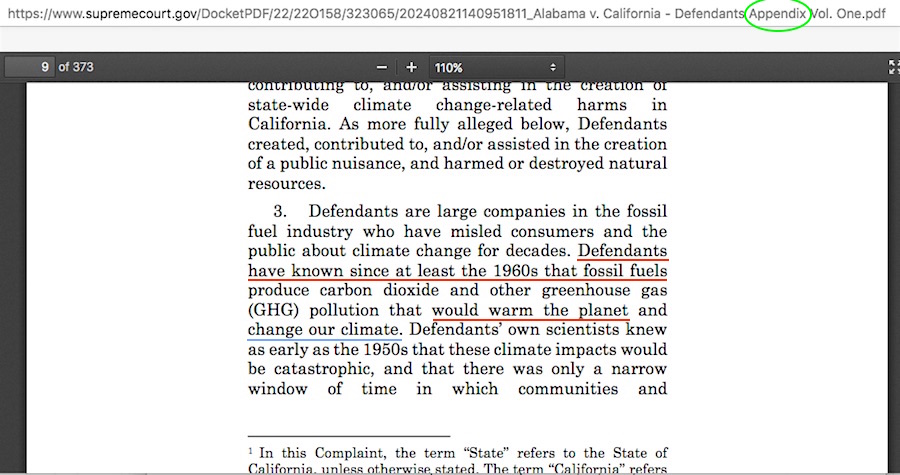 Allow me to explain my small error first. Who actually reads multi-hundred page lawsuit filings start-to-finish? I don’t. I remember hearing one speaker at a Heartland Institute climate conference say he was a lawyer, but that lawyers themselves don’t read other lawyers’ lawsuits, they just read the introduction and the conclusion and hope that what’s in between corresponds to both. I don’t even do that much, I simply use my checklist of phrases and names to see if a filing regurgitates any elements of the false narrative that skeptic climate scientists were paid by fossil fuel company executives to spread disinformation. What I had not caught about about Platkin et al.’s 373 page-long “Appendix Volume One” was that it was nothing more than the complete individual lawsuit filings by AGs Bonta, Tong, and Ellison. Since other lawsuit filings had been as long as 240+ pages, I figured this Appendix might just only be the same kind of effort, with an extra hundred or so extra pages on esoteric court jurisdiction technicalities.