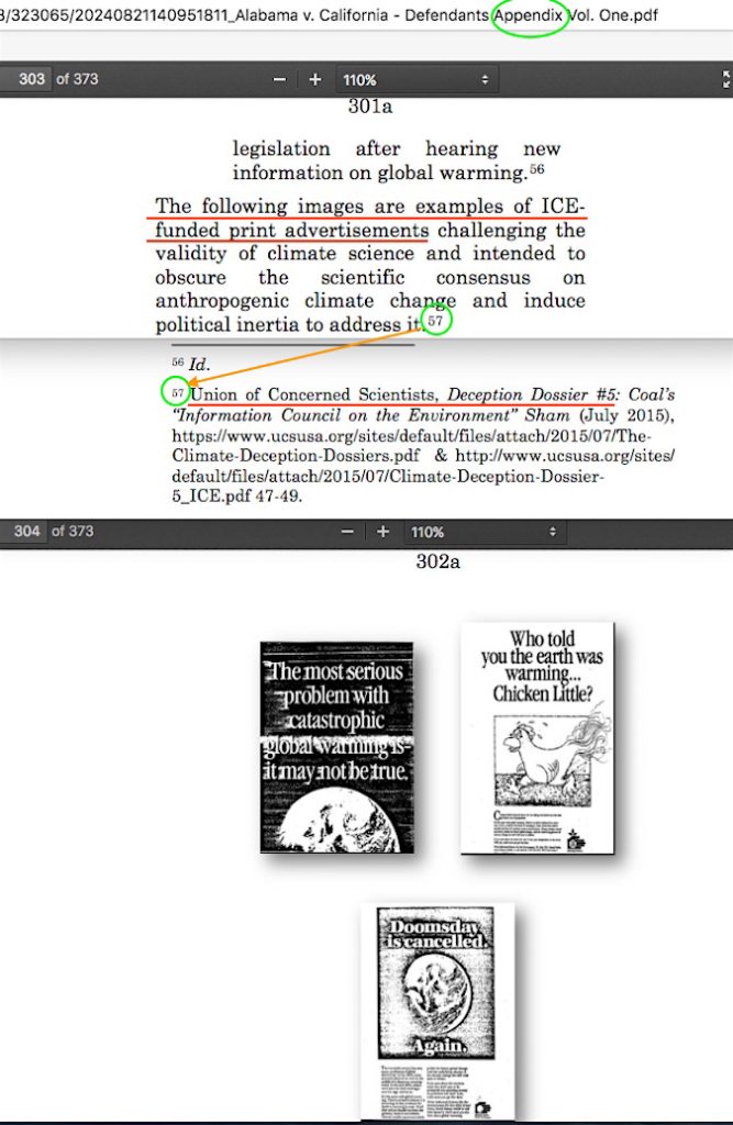 ✓ PDF pages 303-304 — the ‘industry disinformation’ ads. Both the “Chicken Little” advertorial and the “Doomsday is Canceled” advertorials were never published anywhere. The 3rd advertorial, “The Most Serious Problem” one was published, but the illustration is disingenuously cropped, where its otherwise non-disinforming text has been removed. Again, there’s that Greenpeace/Ozone Action false accusations problem. Piling on, this giant Appendix copy of AG Ellison’s filing cites UCS as the source for the ad scans. UCS can’t figure out the actual name of the genuine ICE campaign – it’s “Information Council for the Environment,” not on, but not only that, who do they cite as its source for these? Wait for it . . . . . . . . . . the above-noted Greenpeace scans collection, back when it was still online.