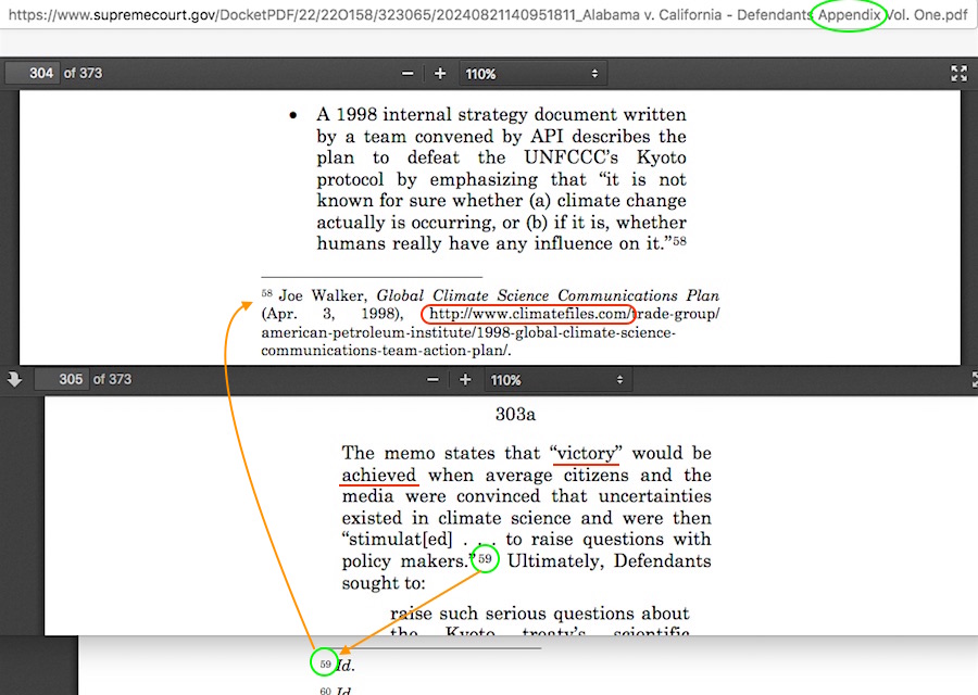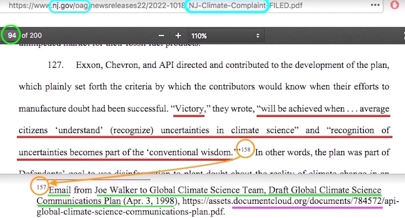 ✓ “Appendix Volume One” PDF pages 304-305 — the “victory will be achieved” memos, which were never implemented (never implemented!) in any form anywhere. I have multiple posts explaining myriad faults with the entire situation surrounding that accusation. Among the faults is how the San Francisco law firm Sher Edling apparently hides their source of the memo scans behind an innocuously-looking “DocumentCloud” file site (e.g. in their filing done for NJ AG Platkin), when the file is more directly seen via just 6 small changes to Sher Edling’s citation file address as an upload by the 2013-era Greenpeace worker Kert Davies. Hold the thought about Davies’ name for a moment, as you read the next section.