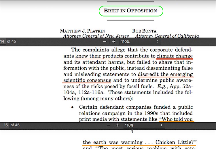 Notice in that reference to the “Chicken Little” ad, Platkin et al. claims it an indicator that the fossil fuel industry ‘knew’ their products caused climate change, but chose to undercut the ‘science consensus’ and deceive the public. “Knew,” meaning as far back as the ’60s / ’70s, as they imply elsewhere in their BiO. For all the effort to drag this discussion in front of the Supreme Court to argue over whether states can file such lawsuits or if these need to be restricted to the Federal Court system, it’s irrelevant where anybody files any lawsuit which makes claims about certain activities, when those claims are flat out false.