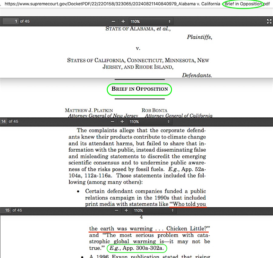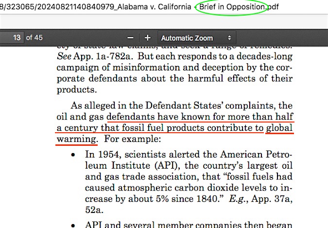 As I noted in my April 2nd & 3rd 2025 Tweets/Xs, I had only just learned about the 45 page Aug 21, 2024 “Brief in Opposition” (BiO) that NJ AG Matt Platkin, CA AG Rob Bonta, MN AG Keith Ellison, Connecticut AG William Tong, and Rhode Island AG Peter Neronha had filed against Alabama et al. v California et al — Alabama Attorney General Steve Marshall and four other state AGs complaint arguing that the U.S. Supreme Court should prevent states from filing such global warming damages lawsuits. My intention was to dissect the massive accusation faults in the “Appendix Volume One” attached to the Platkin et al. BiO, while mistakenly thinking that the Appendix itself was newly written in August 2024 especially for SCOTUS review. I was technically headed down an incorrect path – sorta – and was nearly done with my intended blog post before spotting my small error of assumption. The bulk of what I’d written still serves the purpose I’d intended, which is to point out the incalculably huge error these five Platkin et al. Attorneys General made in following the path that ‘Exxon knew about their products causing global warming, but chose instead to deceive the public through disinformation campaigns where they paid and directed skeptic climate scientist shills to repostition global warming as theory rather than fact.’